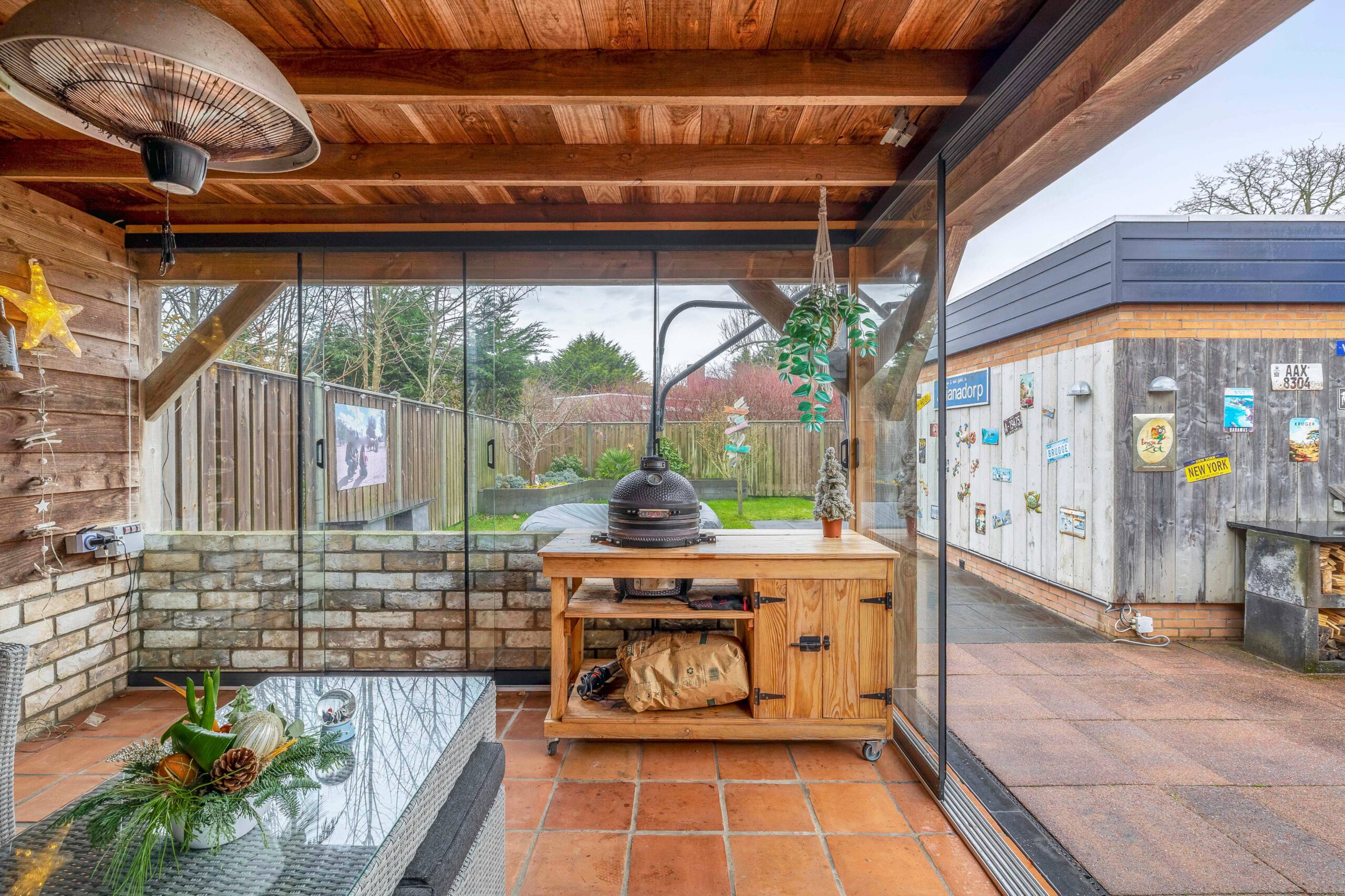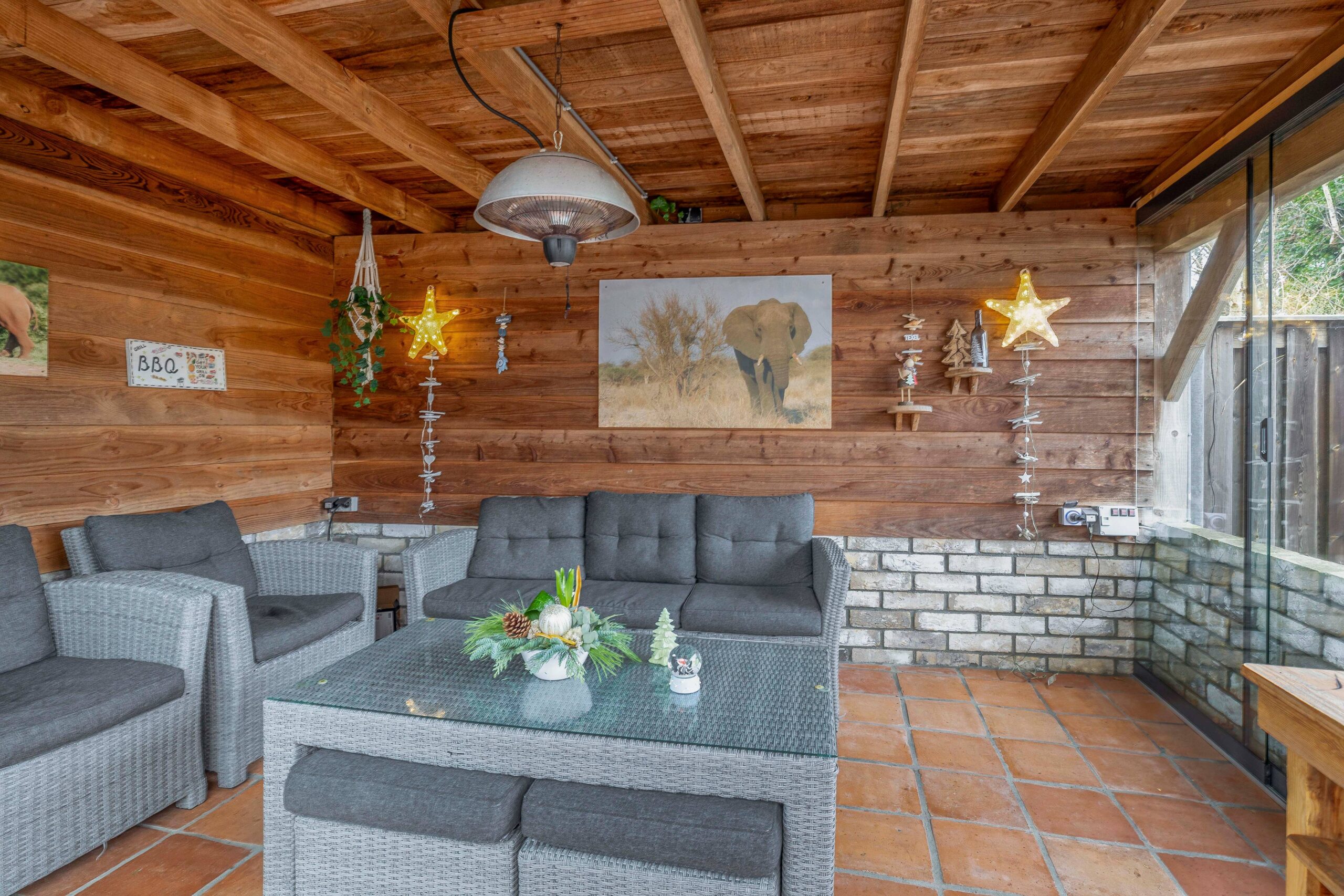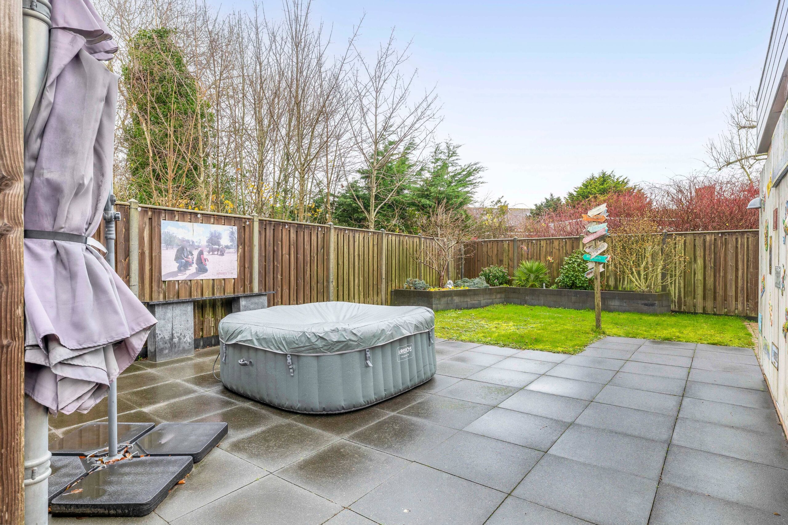 De achtertuin is ook zeer riant met bestrating en gazon. Een mooie grote overkapping met glazen deuren waar je heel veel uurtjes in kunt doorbrengen. De zijtuin heeft openslaande deuren naar de voorzijde.