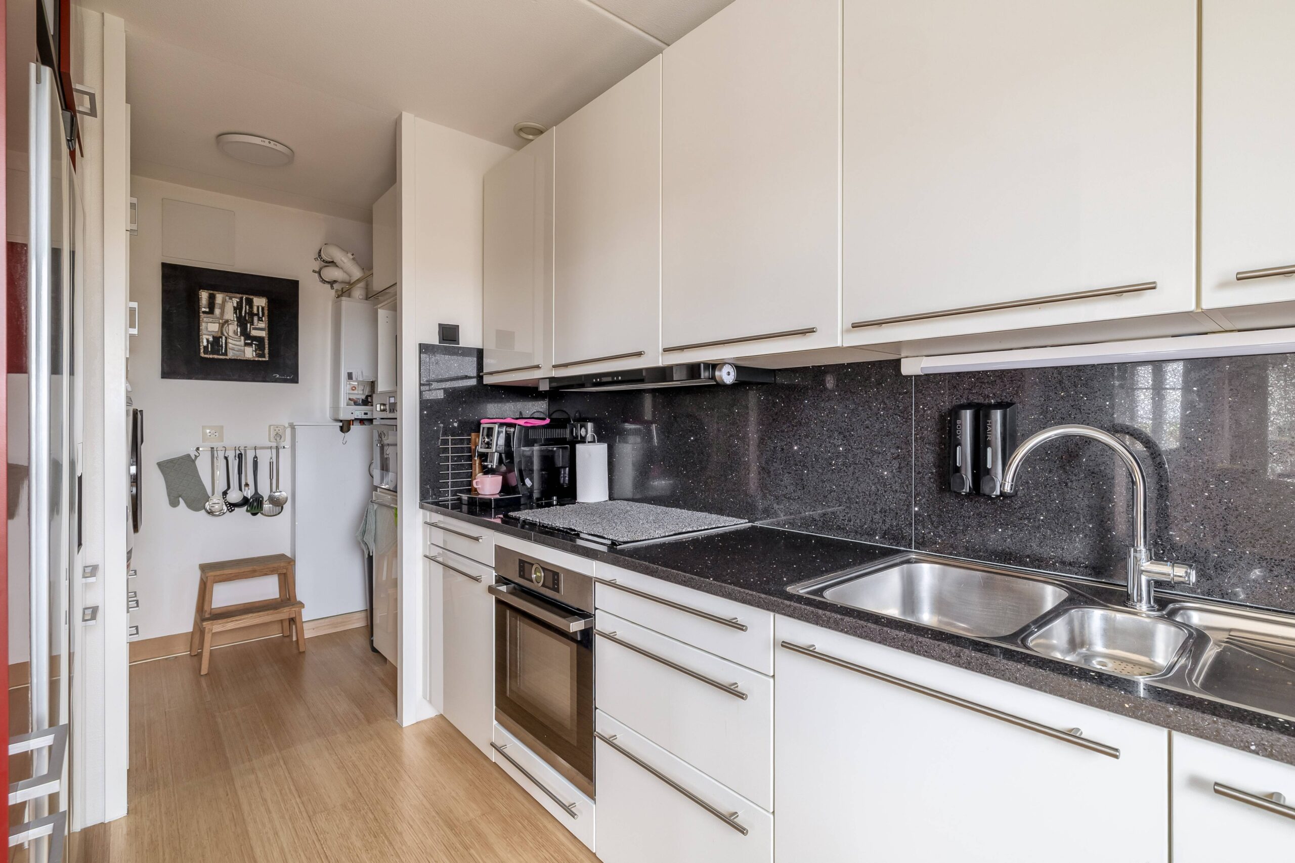 De keurige inbouwkeuken is uitgerust met alle wenselijke apparatuur: inductiekookplaat, afzuigkap met plasmafilter, vaatwasser, combimagnetron en losse koel-vriescombinatie. Aansluitend een praktische bijkeuken waar de wasmachine en wasdroger op hoogte staan.