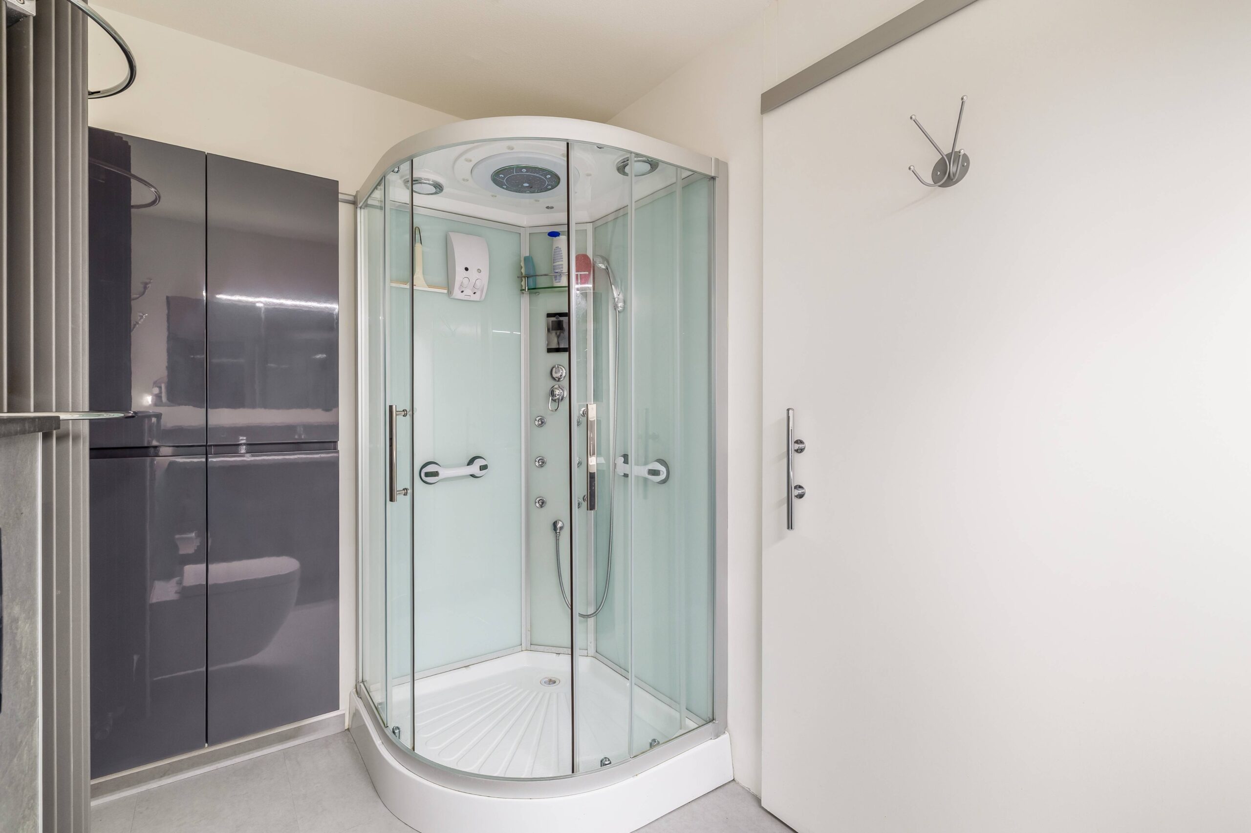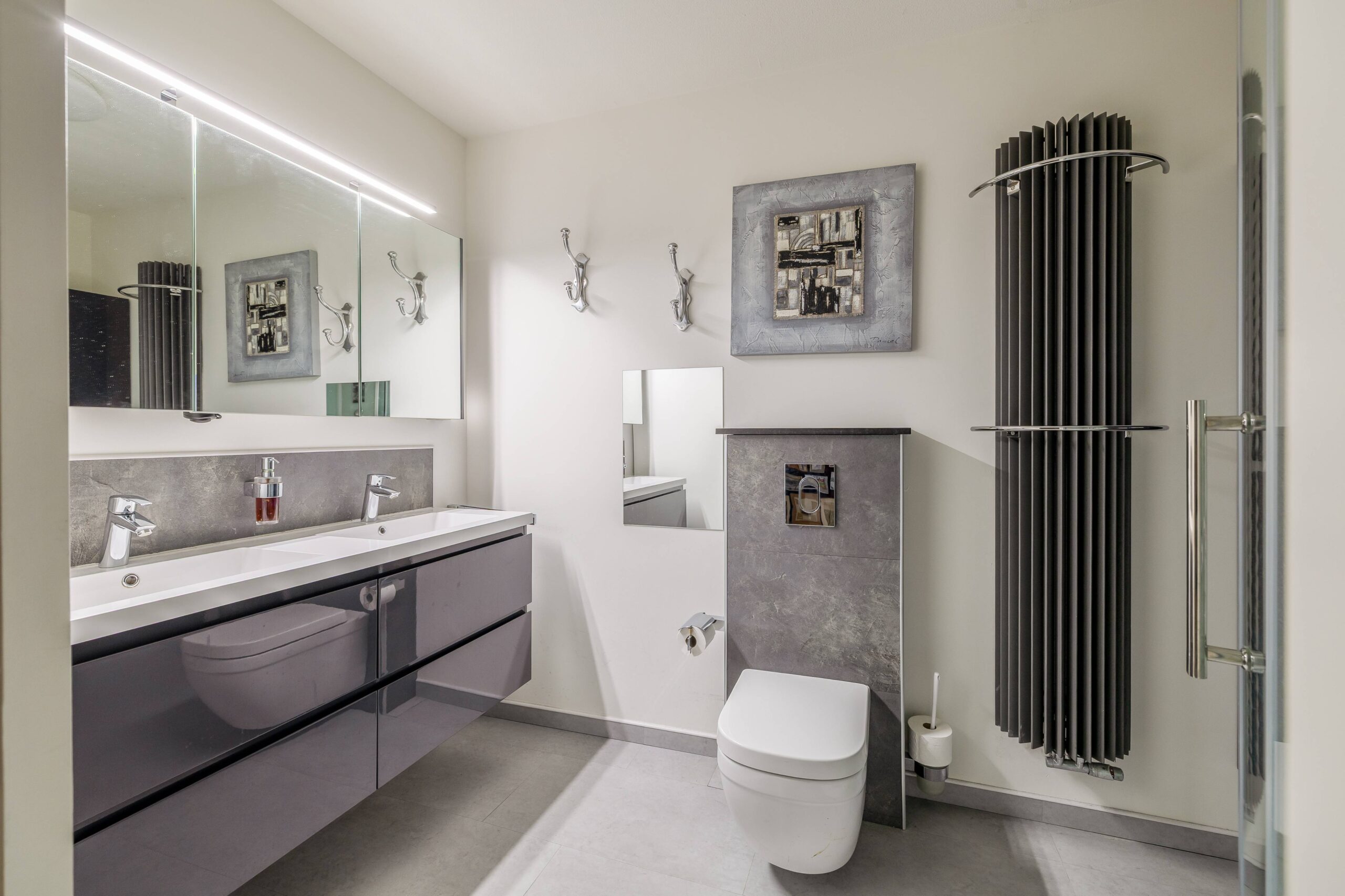 Ook het sanitair is keurig uitgevoerd: een modern gastentoilet met fontein en moderne badkamer met wastafelmeubel met 2 kranen en een spiegelkast, ruime volledig afsluitbare douchecabine, 2e vrijdragend toilet en handdoekradiator.