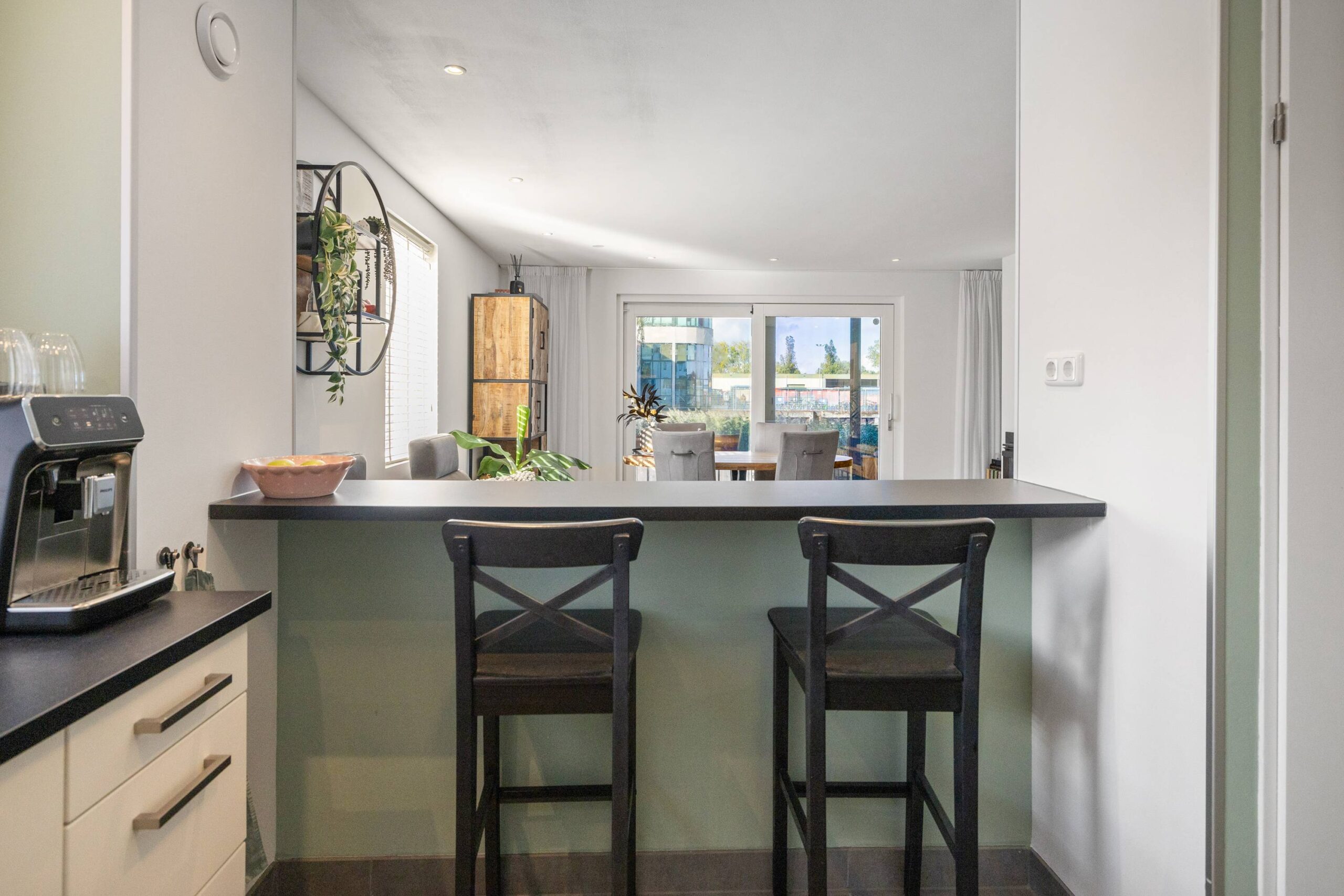 De open keuken is volledig uitgerust met inbouwapparatuur en nog een afscheiding met barkrukken.