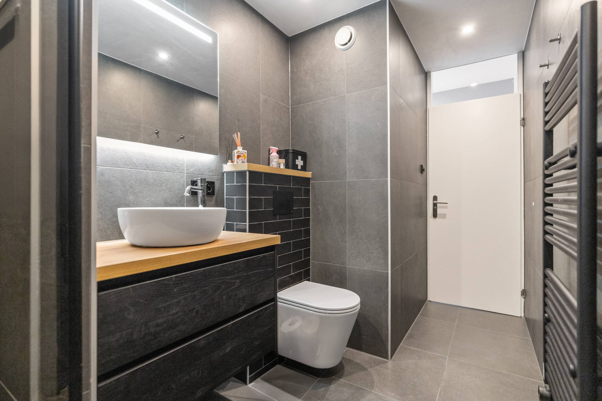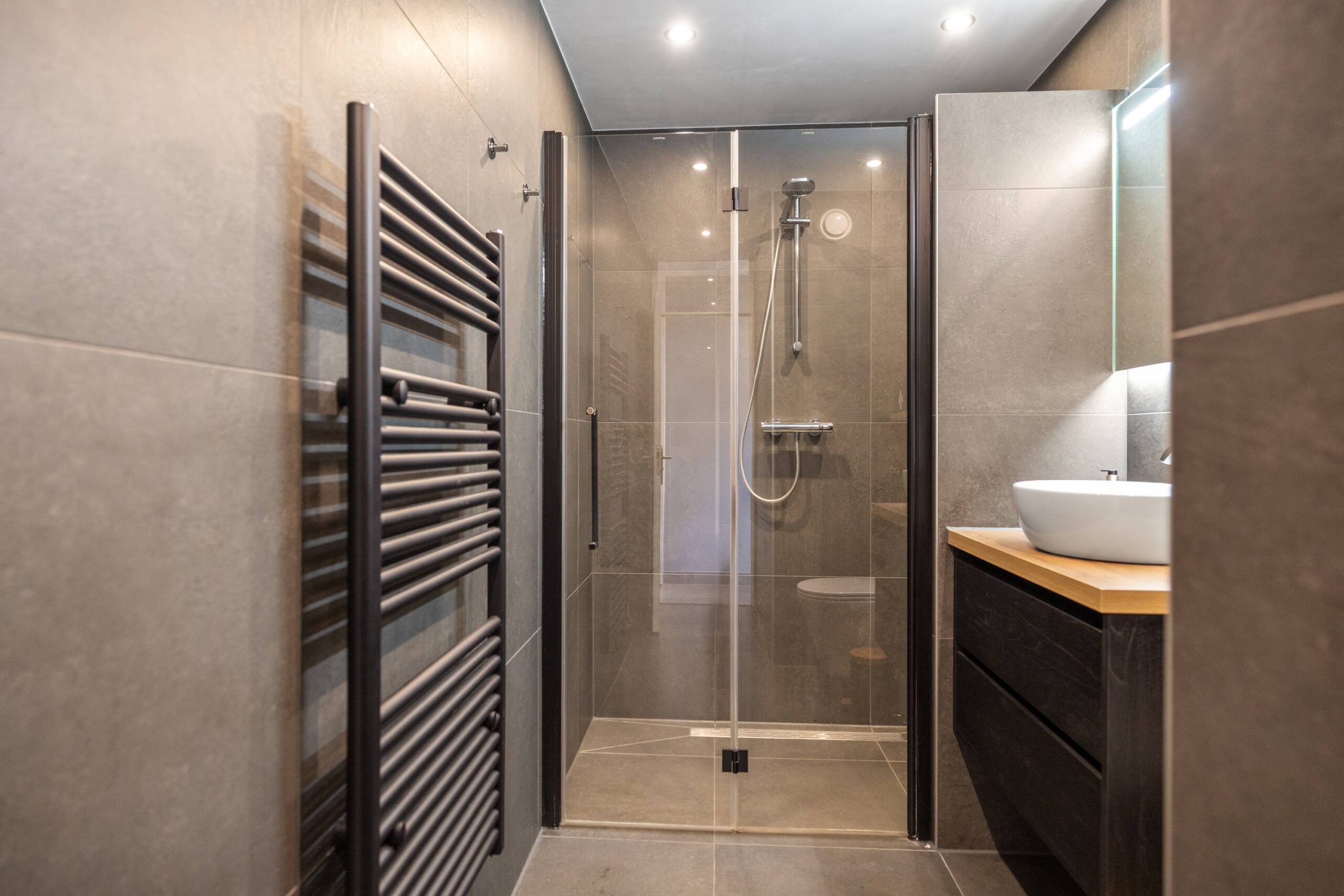 Ook de badkamer is stijlvol, met een inloopdouche, wastafelmeubel, toilet, wastafelmeubel en elektrische radiator.