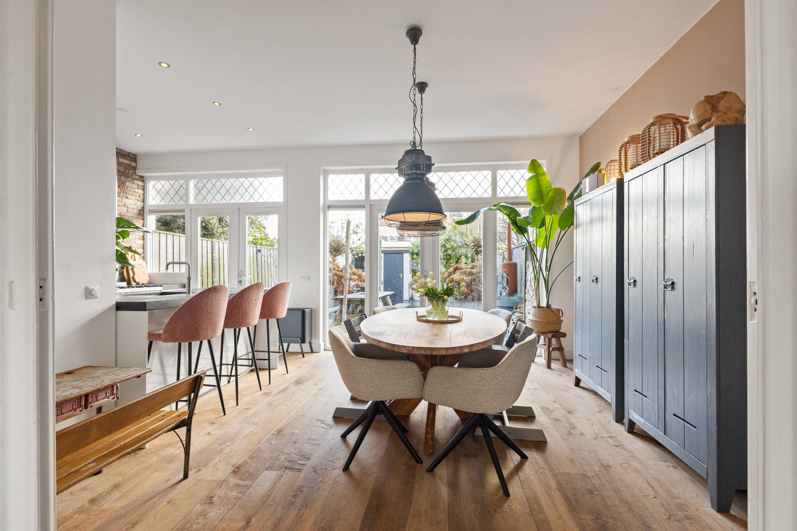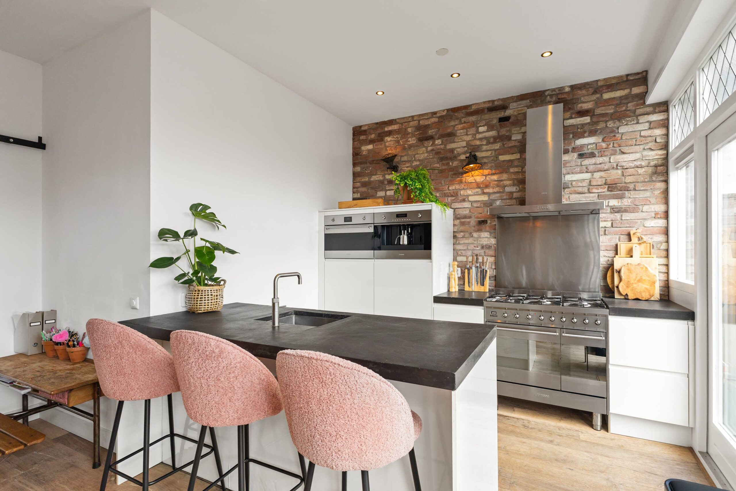 De woonkeuken heeft ruimte voor een eettafel, een grote kast en ook voor gezellige barkrukken als je aan het keukenblad wilt zitten. De keuken zelf is luxe en ingericht met een koelkast, vriezer, Smeg fornuis met oven, een magnetron, inbouw koffiezetapparaat en de vaatwasser. Dubbele deuren naar de zonnige tuin.