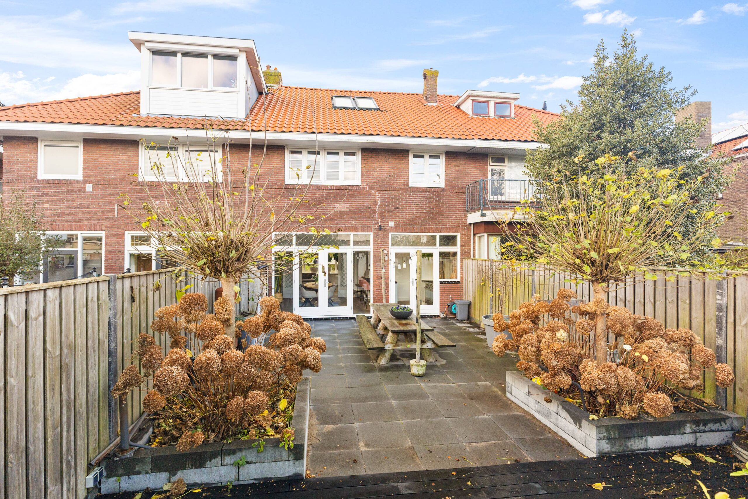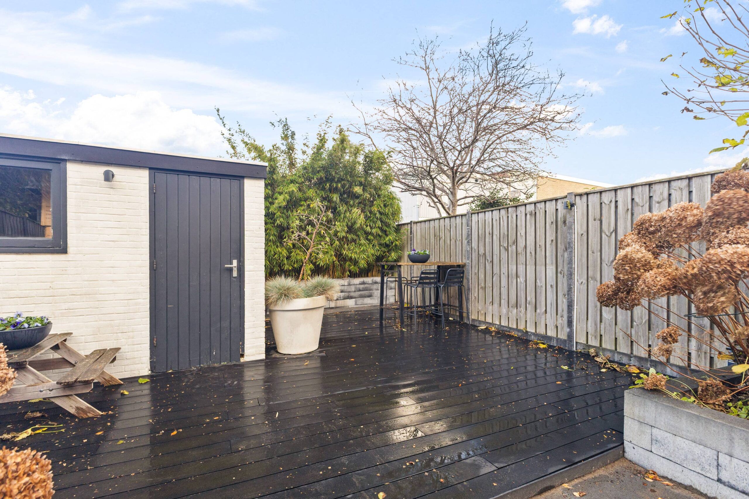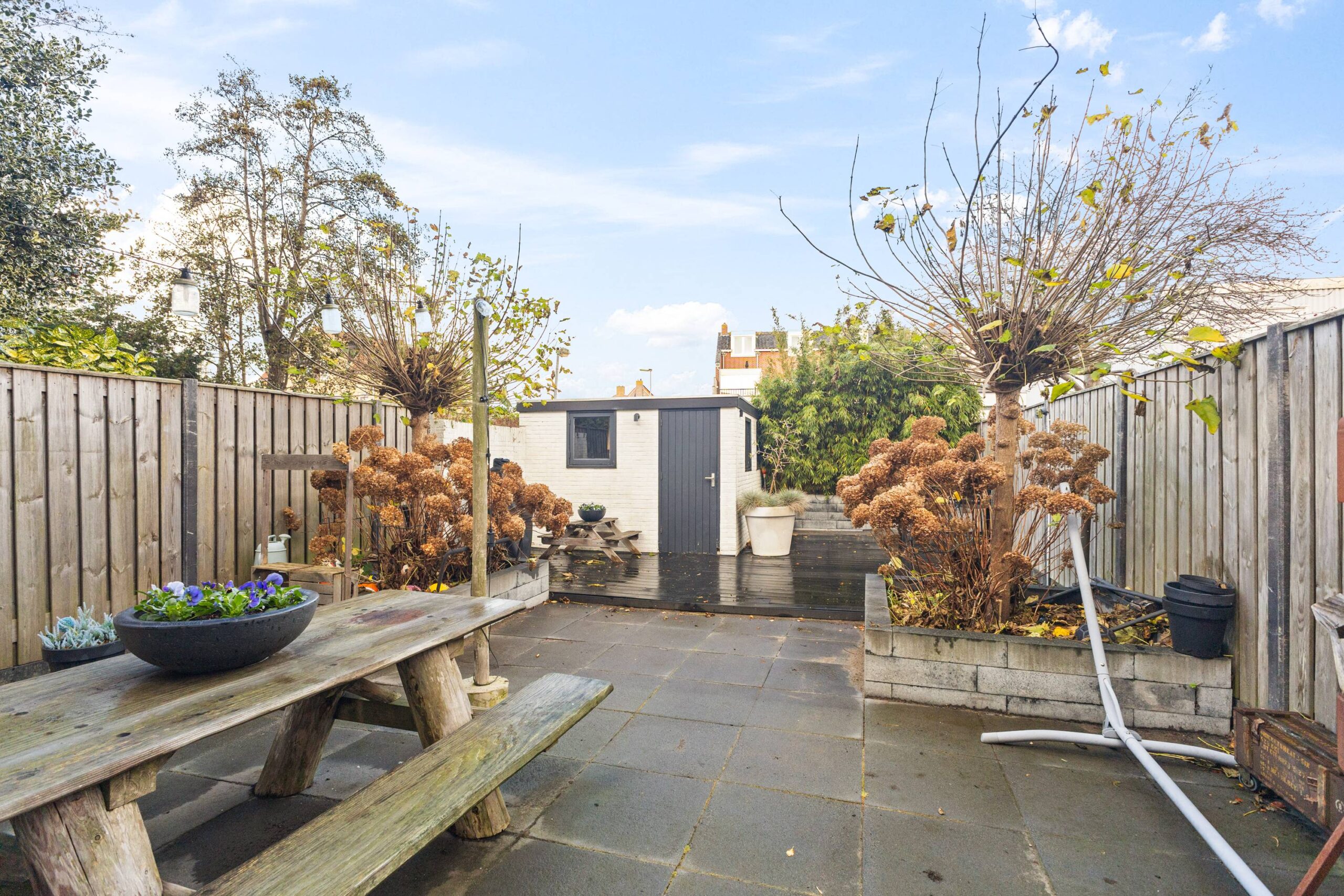 De tuin is strak aangelegd met mooie tegels en beplanting. De tuin heeft verlichting en een stenen berging met doorgang naar de Jan Hoogewerfstraat. Kortom een brede straat erachter en geen smalle steeg. Ideaal ook als je een bakfiets hebt of motorrijder bent.