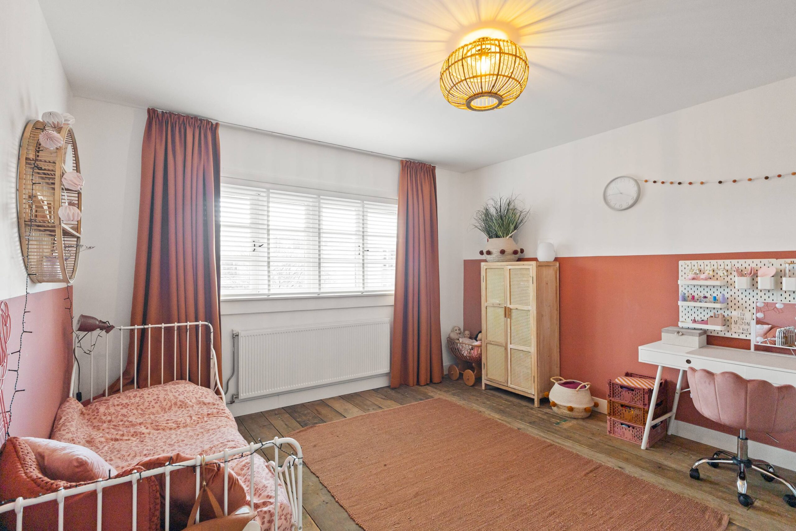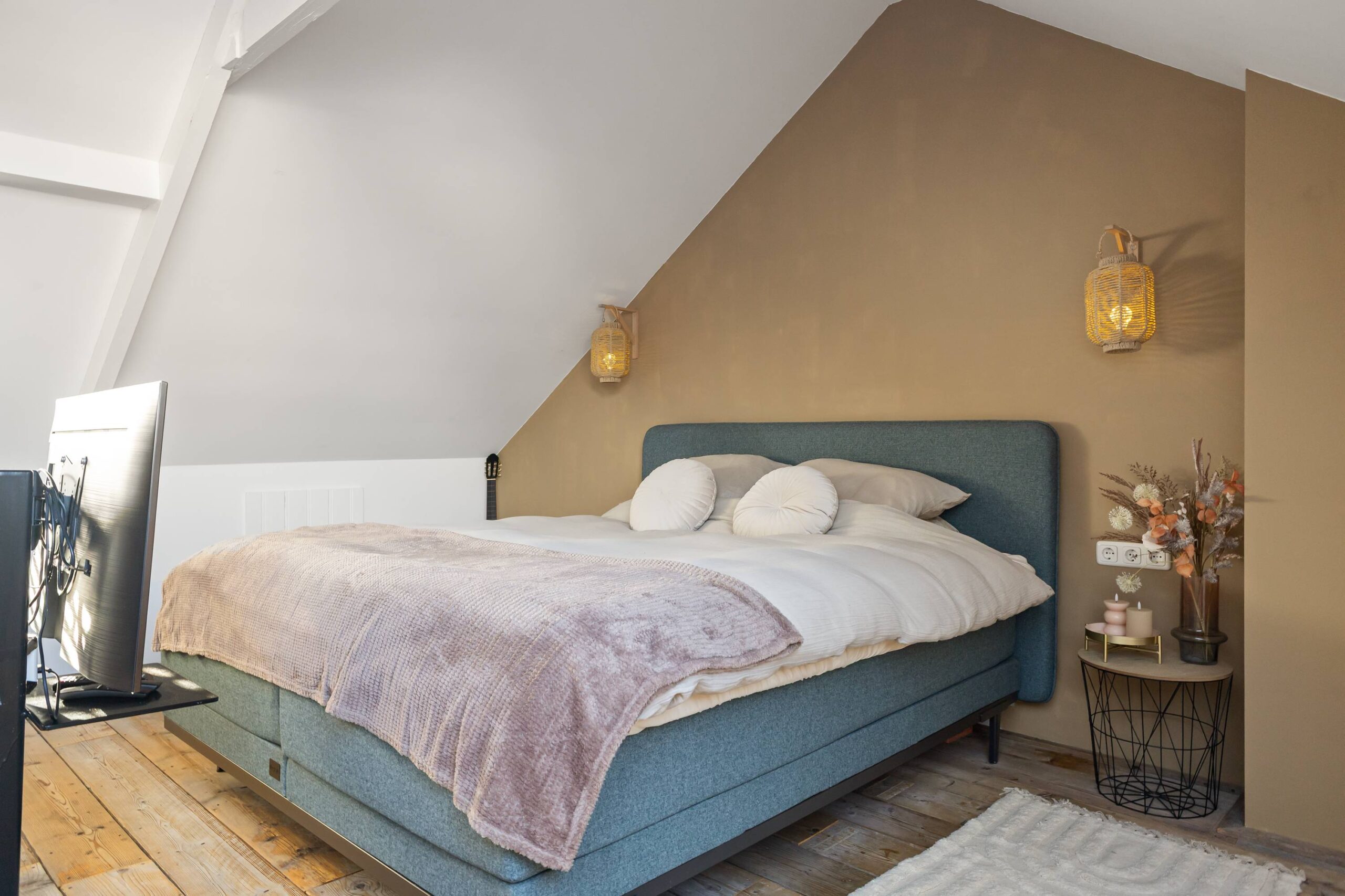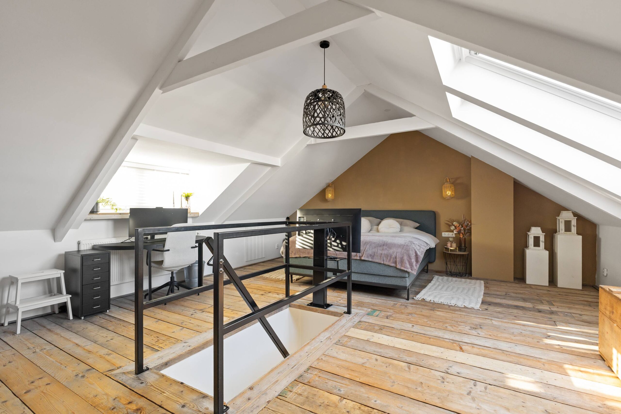 Een inbouwkast op de overloop met de CV ketel (’16) en de opstelling voor het witgoed. Vaste trap naar zolder waar je een balzaal hebt als slaapkamer. Mooie grote Velux dakramen en veel sfeer. Het dak zelf is vernieuwd in 2019 en is geïsoleerd.