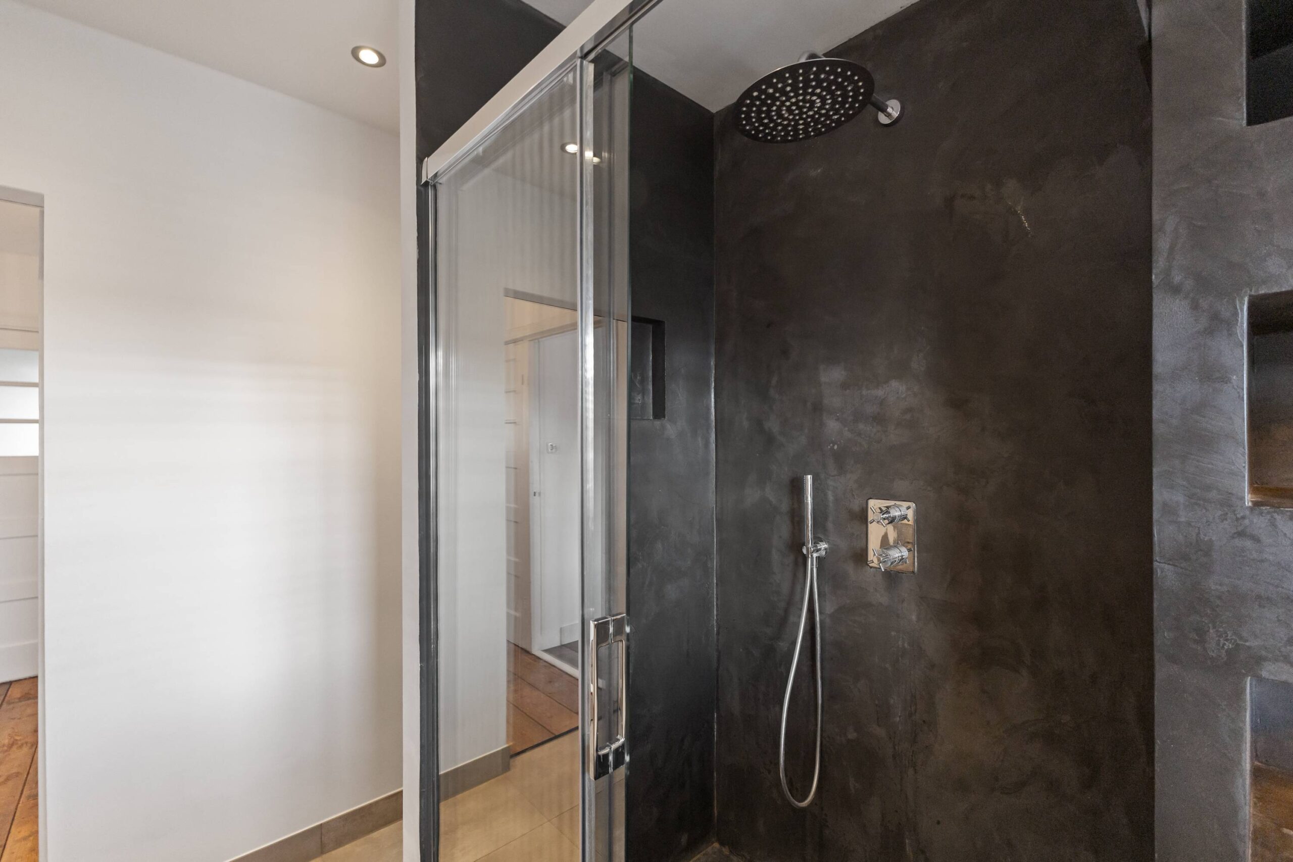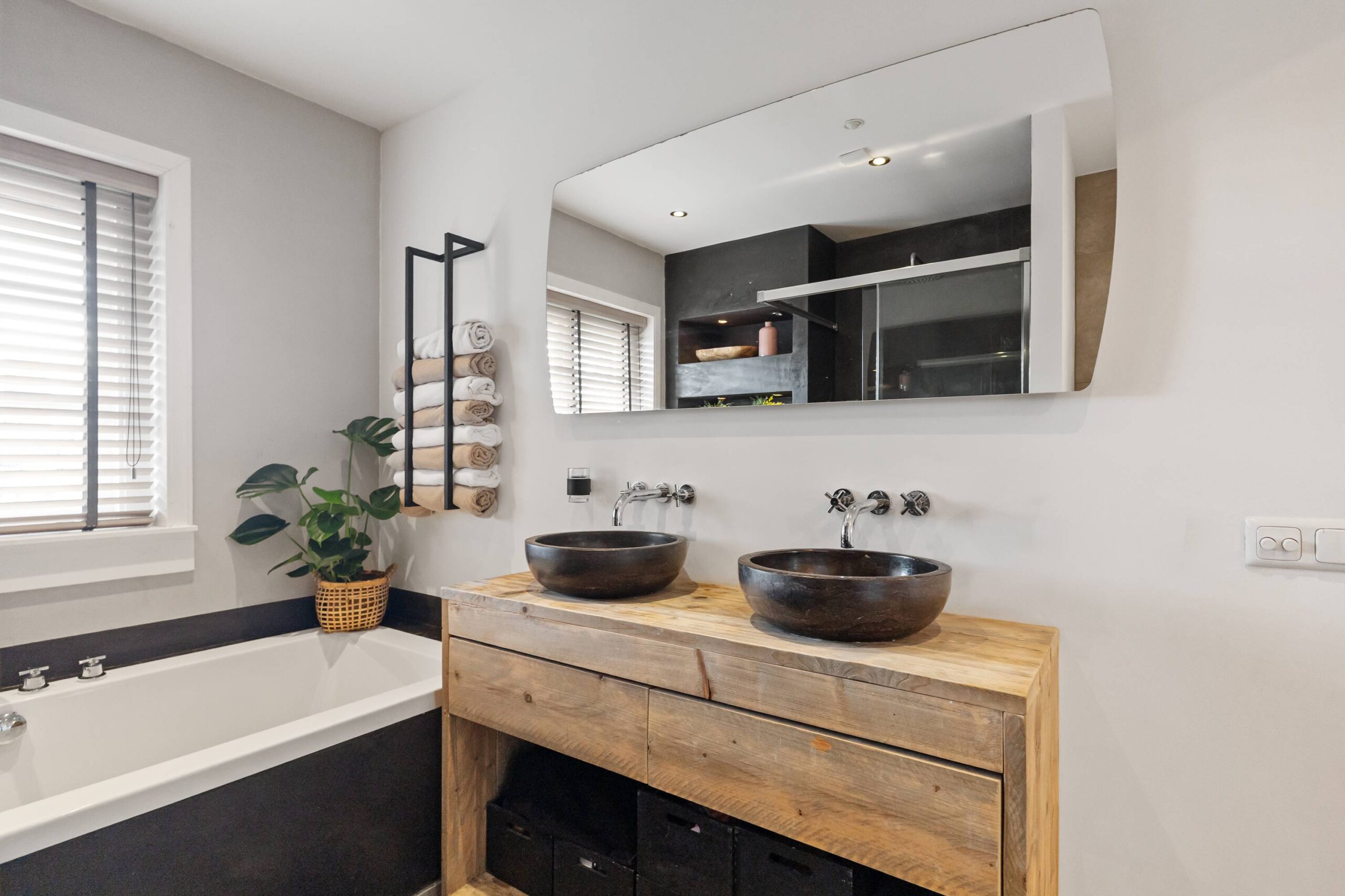 Op de 1e verdieping twee zeer ruime slaapkamers met de originele houten vloer en vaste kasten. De 3e kleinere slaapkamer is thans ingericht als walk in closet. De badkamer is eveneens een plaatje met een douchecabine met schuifdeur, een ligbad, 2e toilet, wastafel en vloerverwarming. Deels gestuukt en deels betegeld.