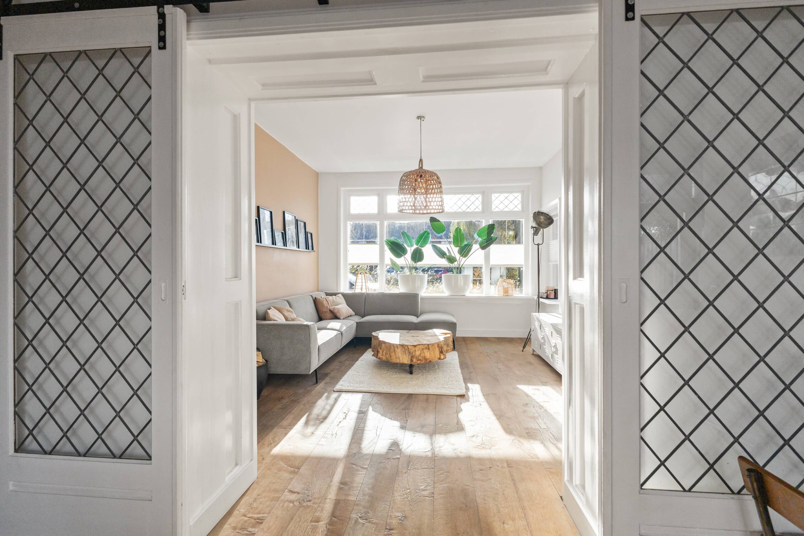Toegang tot de zeer riante woonkamer met betonnen vloer voorzien van vloerverwarming en een mooie houten vloer. De warmte kan je ook halen uit de houtkachel. Kamer en suite schuifdeuren en dubbele tuindeuren aan de achterzijde.