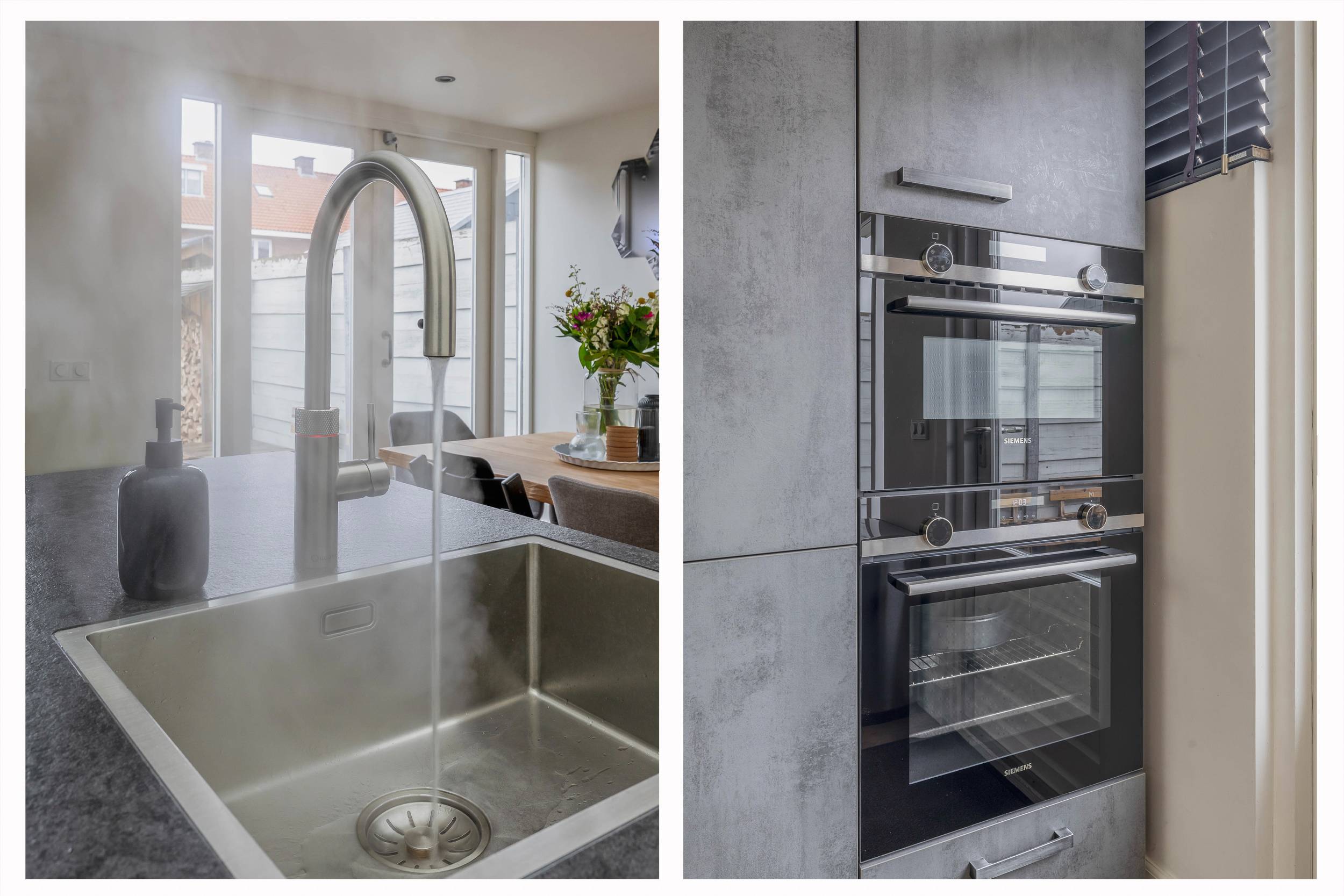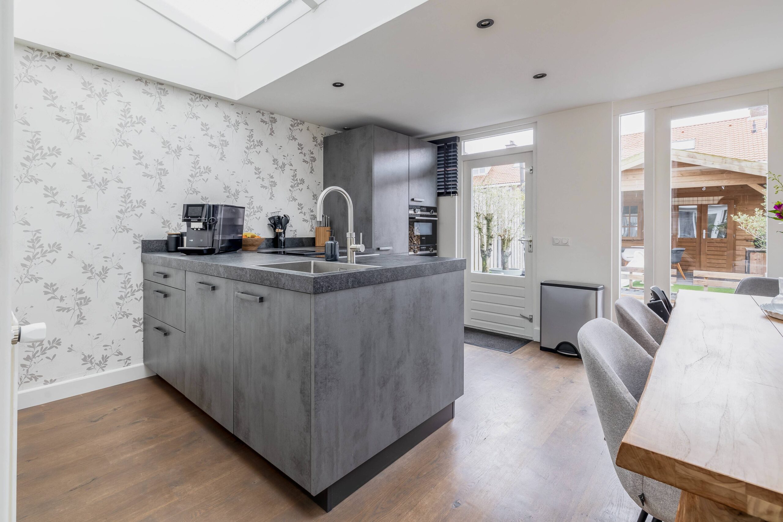 Via de hal met trapopgang betreed je de woning. De oorspronkelijke voor- en achterkamer kunnen middels suitedeuren van elkaar worden gescheiden. Aan de achterzijde ligt de eetkeuken: het echte hart van het huis. De moderne open keuken is licht uitgevoerd en voorzien van een inductiekookplaat met afzuigkap, koel-vriescombinatie, vaatwasser, Quooker flex, combi-oven en magnetron. Dankzij de uitbouw (met lichtstraat) is hier een heerlijke leefruimte ontstaan waar koken, eten en samenzijn samenkomen.