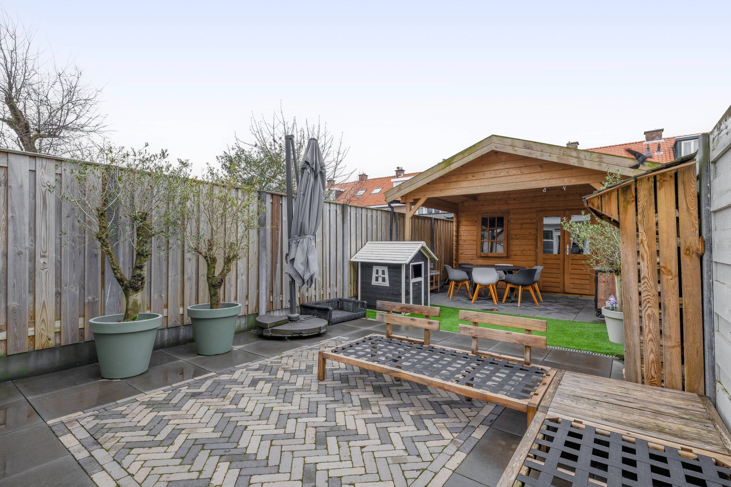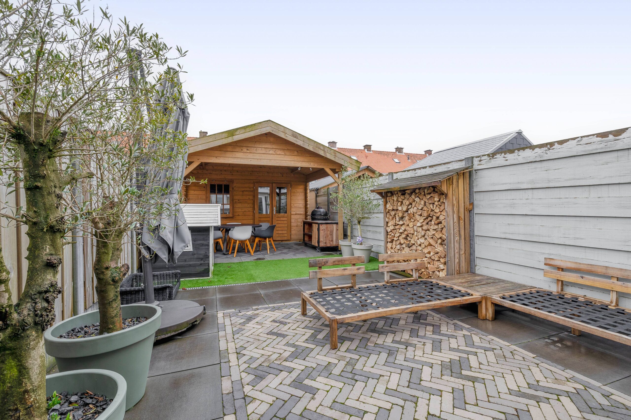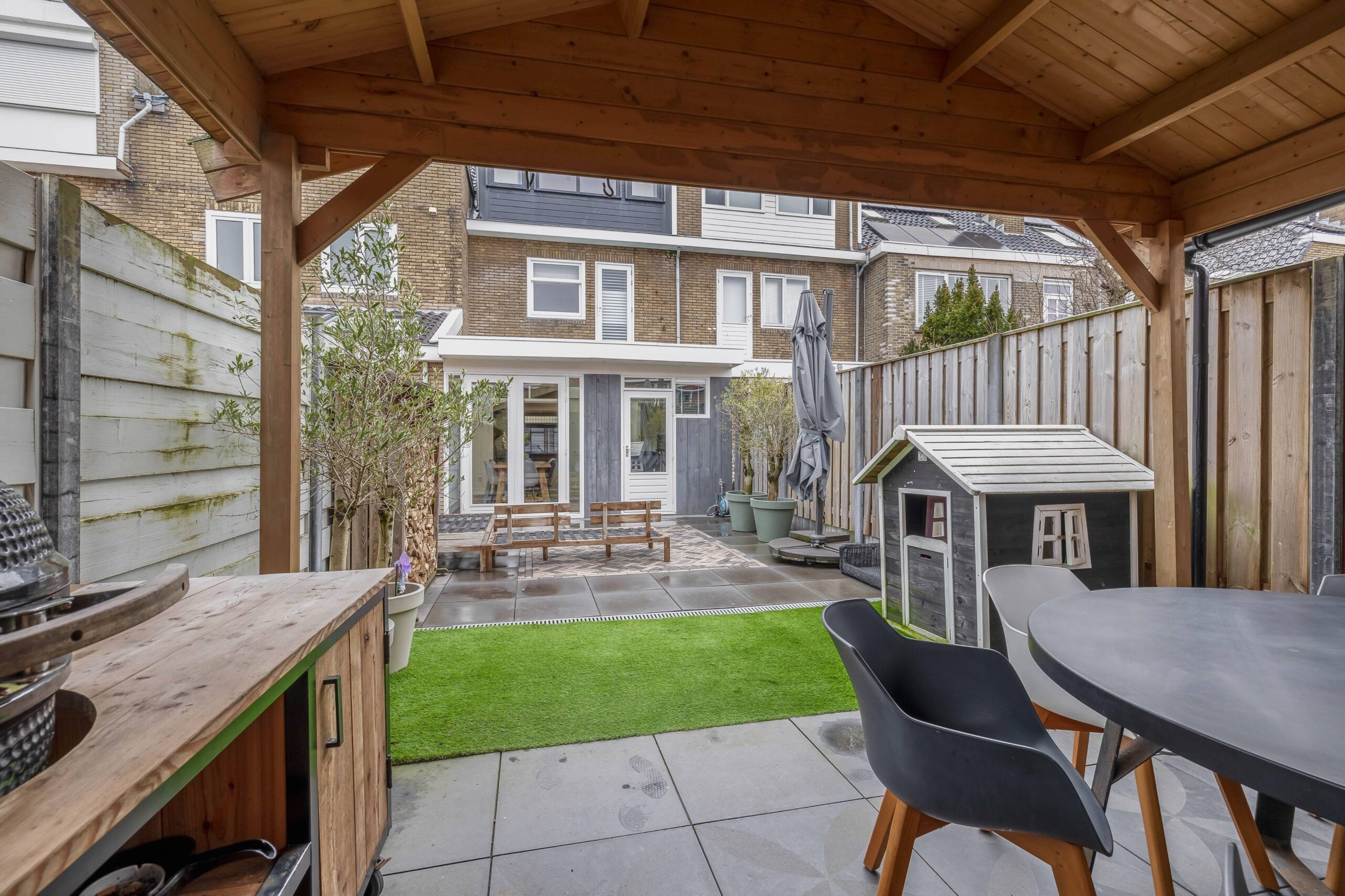 Via de tuindeuren bereik je de fraai aangelegde achtertuin op het zuiden. De tuin is onderhoudsvriendelijk ingericht met sierbestrating en kunstgras, waardoor je meer tijd overhoudt om te ontspannen. Achterin bevindt zich een vernieuwde houten tuinberging met overkapping. Praktisch is de achterom via de berging, evenals de aanwezigheid van een buitenkraan en goede afwatering.