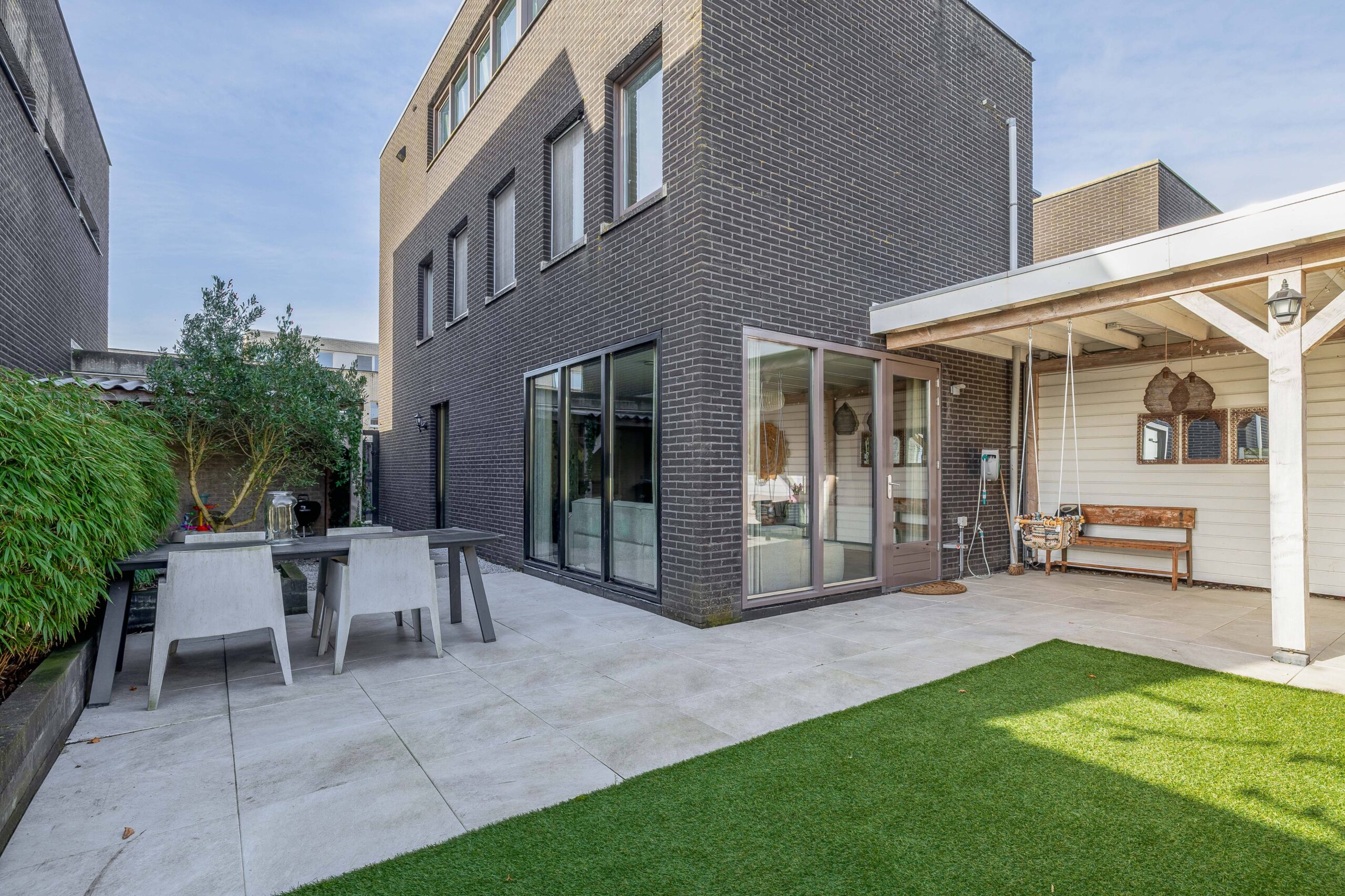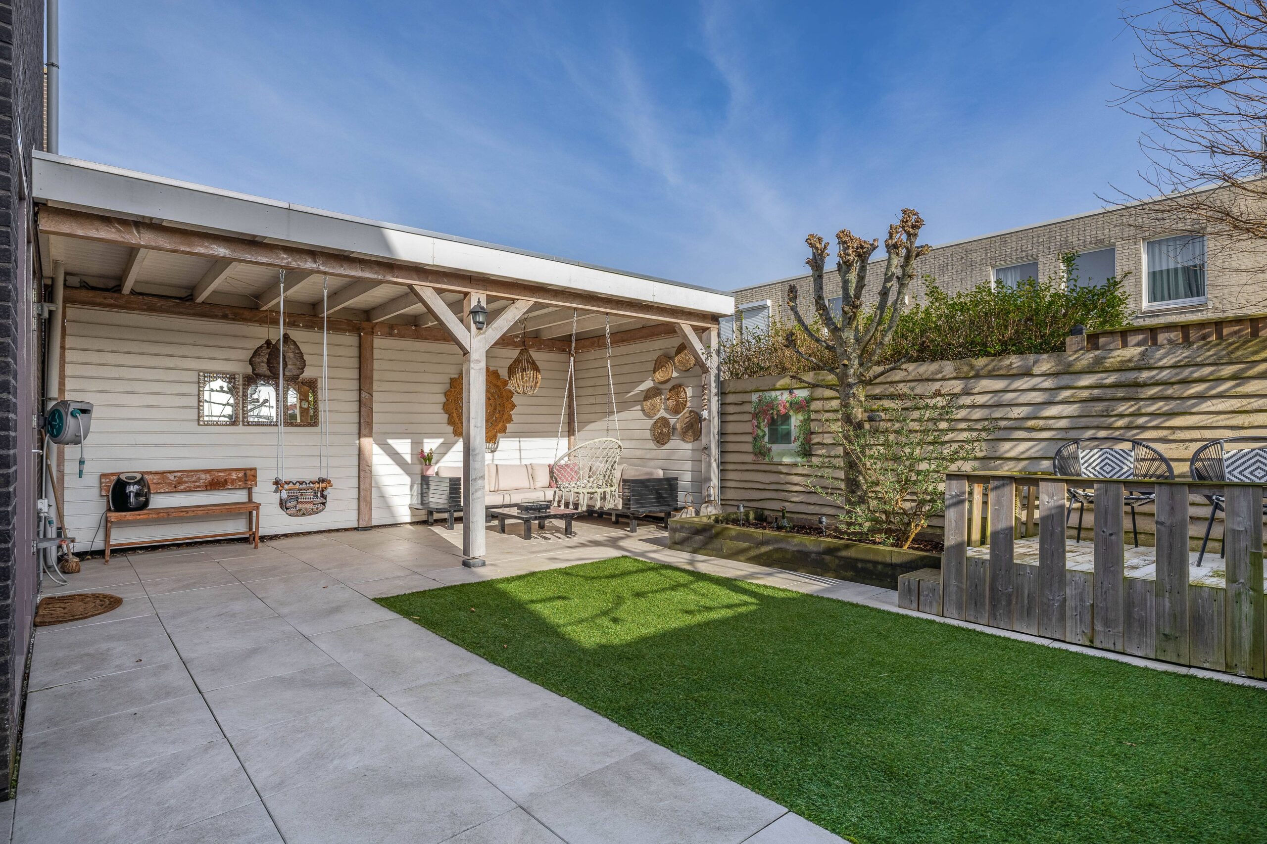 De achtertuin is zeer zonnig en ruim en de tuin loopt rondom de woning. Je hebt hier diverse zitjes, een stukje kunstgras, beplanting en er is een veranda gebouwd waar je lange zomeravonden kunt genieten.