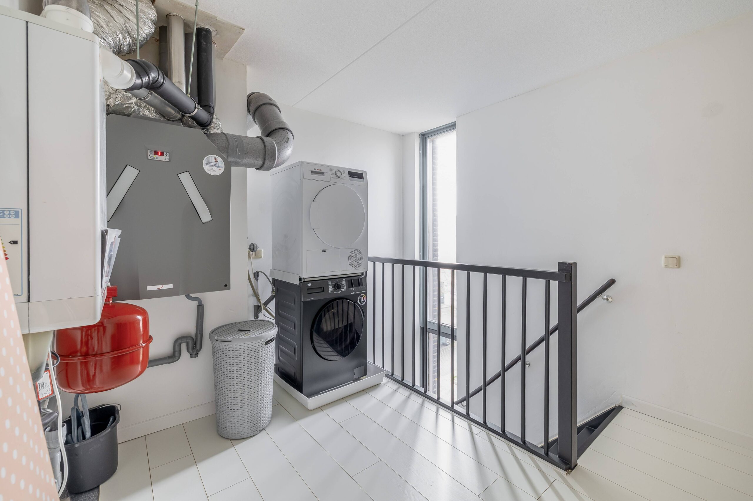 Op de 2e verdieping is de techniek van de woning opgesteld (verwarming en ventilatie) en er is een ruime 4e slaapkamer met een eigen dakterras van ca. 24 m2.