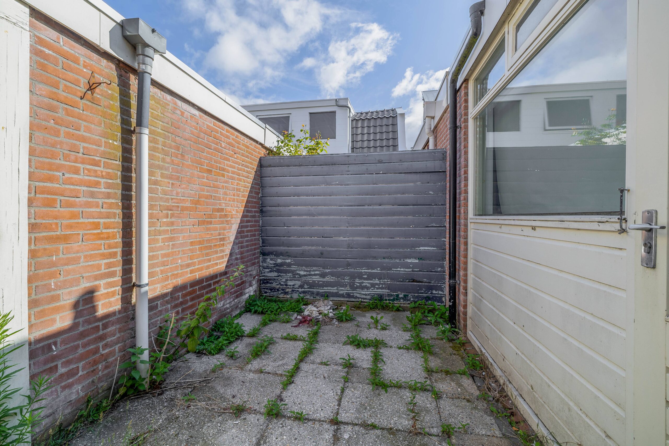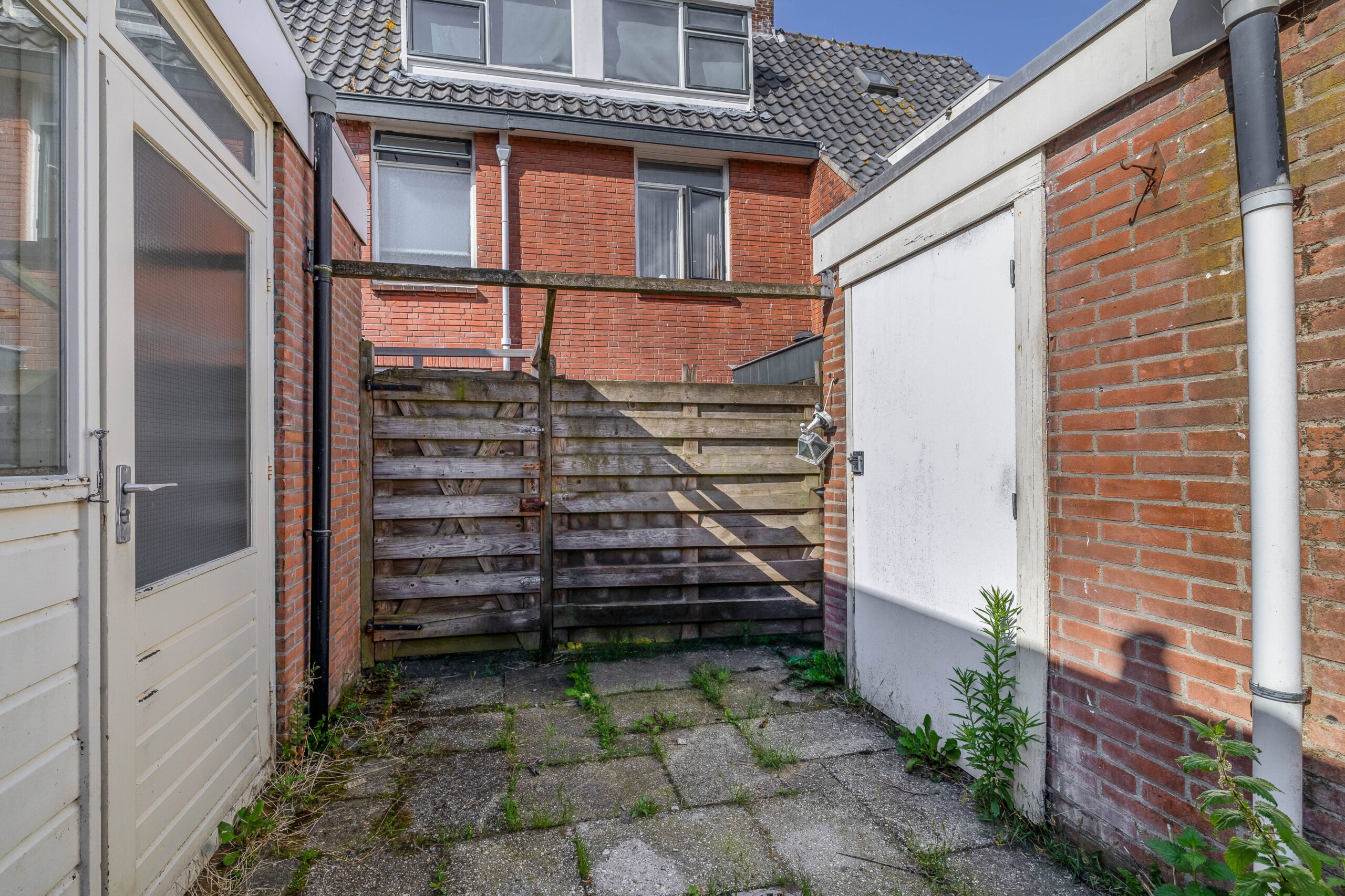 Entree woning, hal met meterkast, trapopgang en toegang tot de woonkamer. Lichte woonkamer met uitzicht op de rustige straat aan de voorzijde en keuken en badkamer in de aanbouw. Vanuit de achterhal stap je de kleine, onderhoudsvriendelijke plaats in, met zijpoort naar de steeg – handig voor fietsen of containers. Achterin staat een vrijstaande stenen berging.