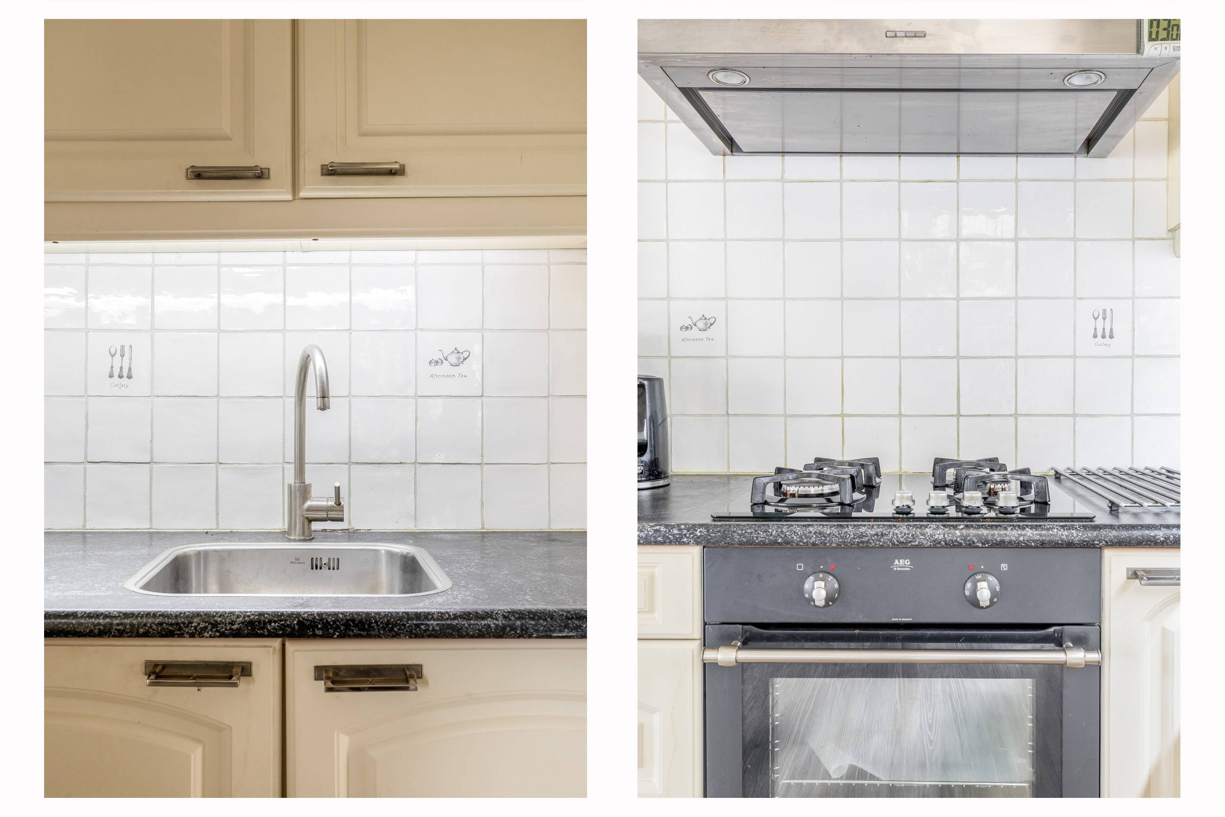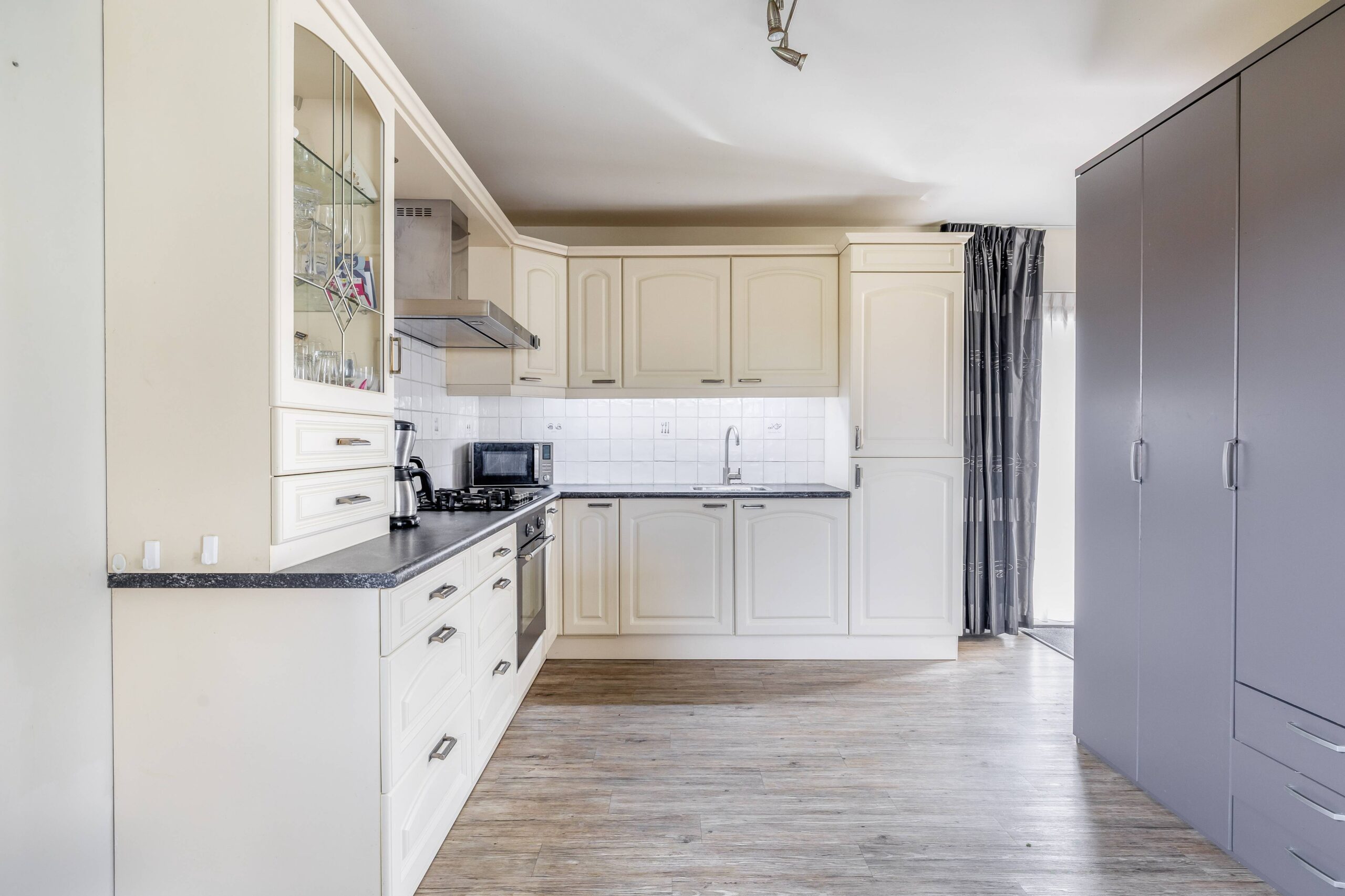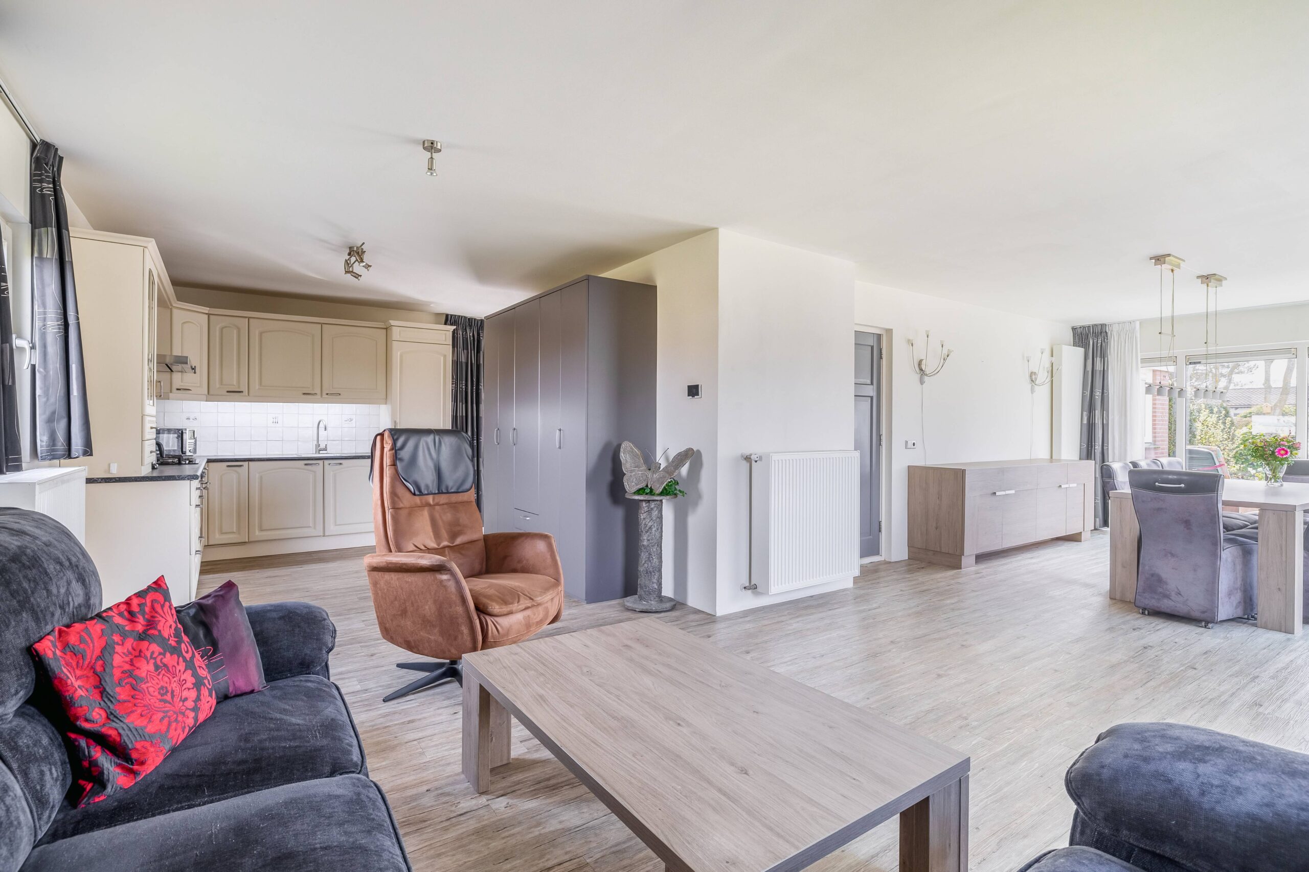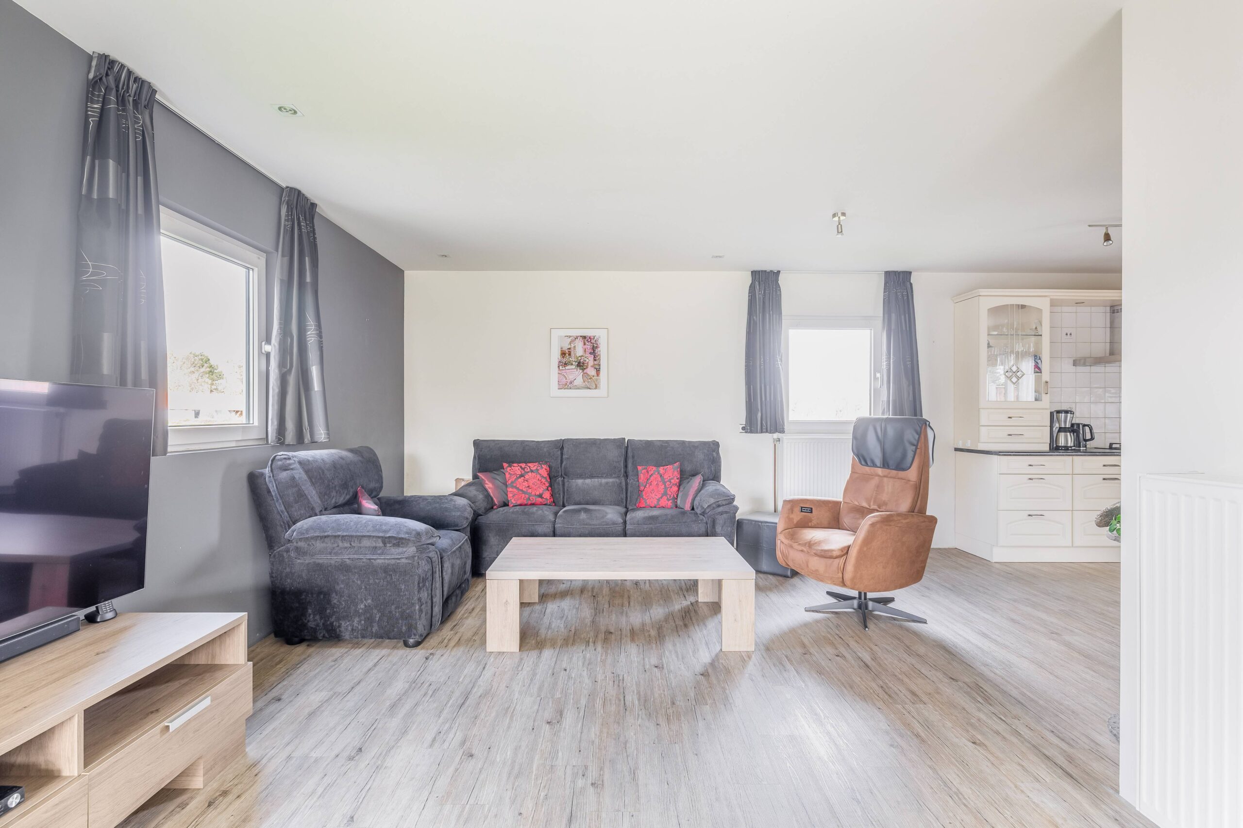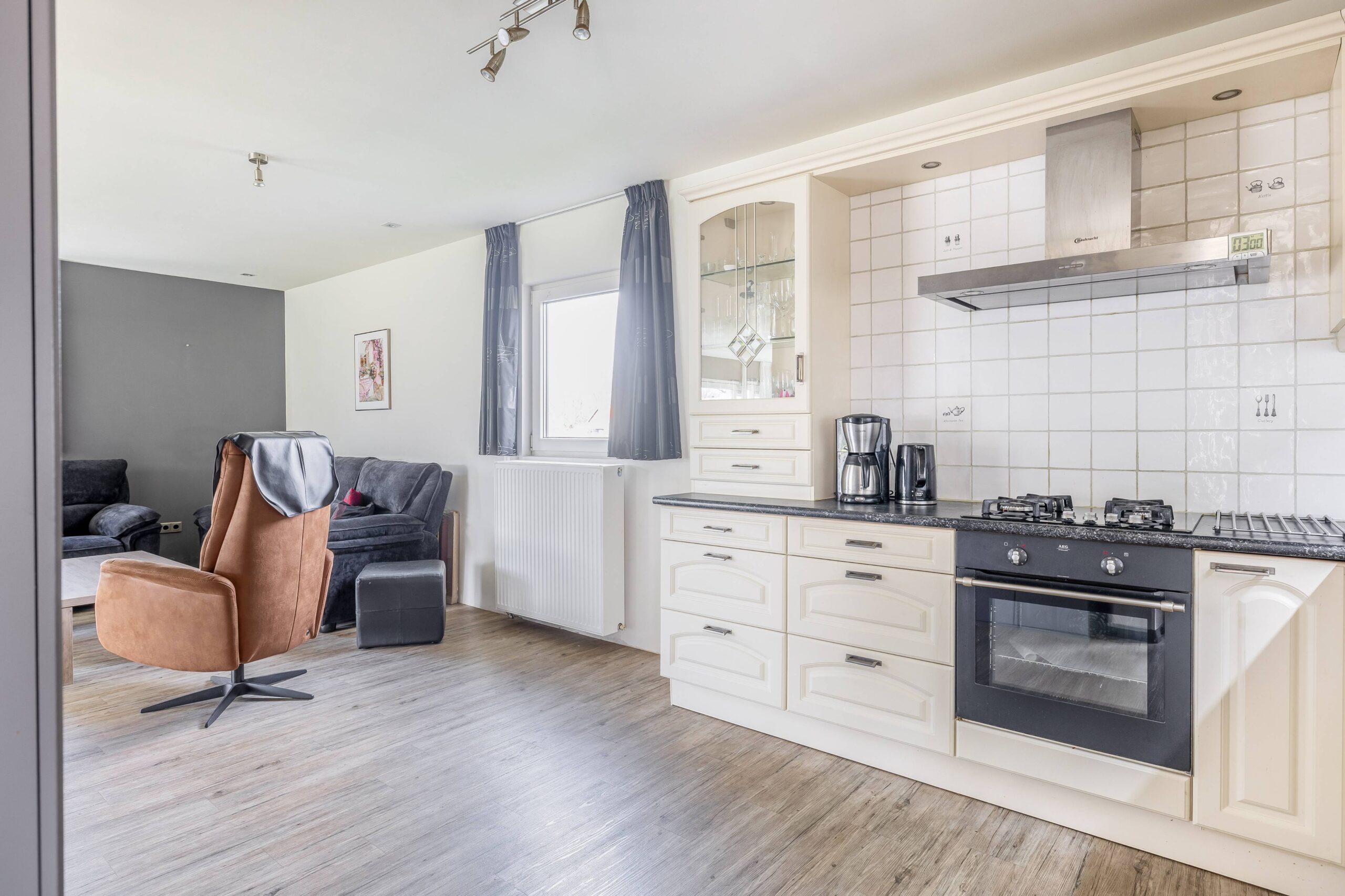 De open keuken is ruim van opzet en netjes, voorzien van diverse inbouwapparatuur. Praktisch detail: in een kast in de woonkamer bevind zich de aansluiting van de wasmachine, netjes uit het zicht weggewerkt maar wel heerlijk als je voor langere tijd verblijft.