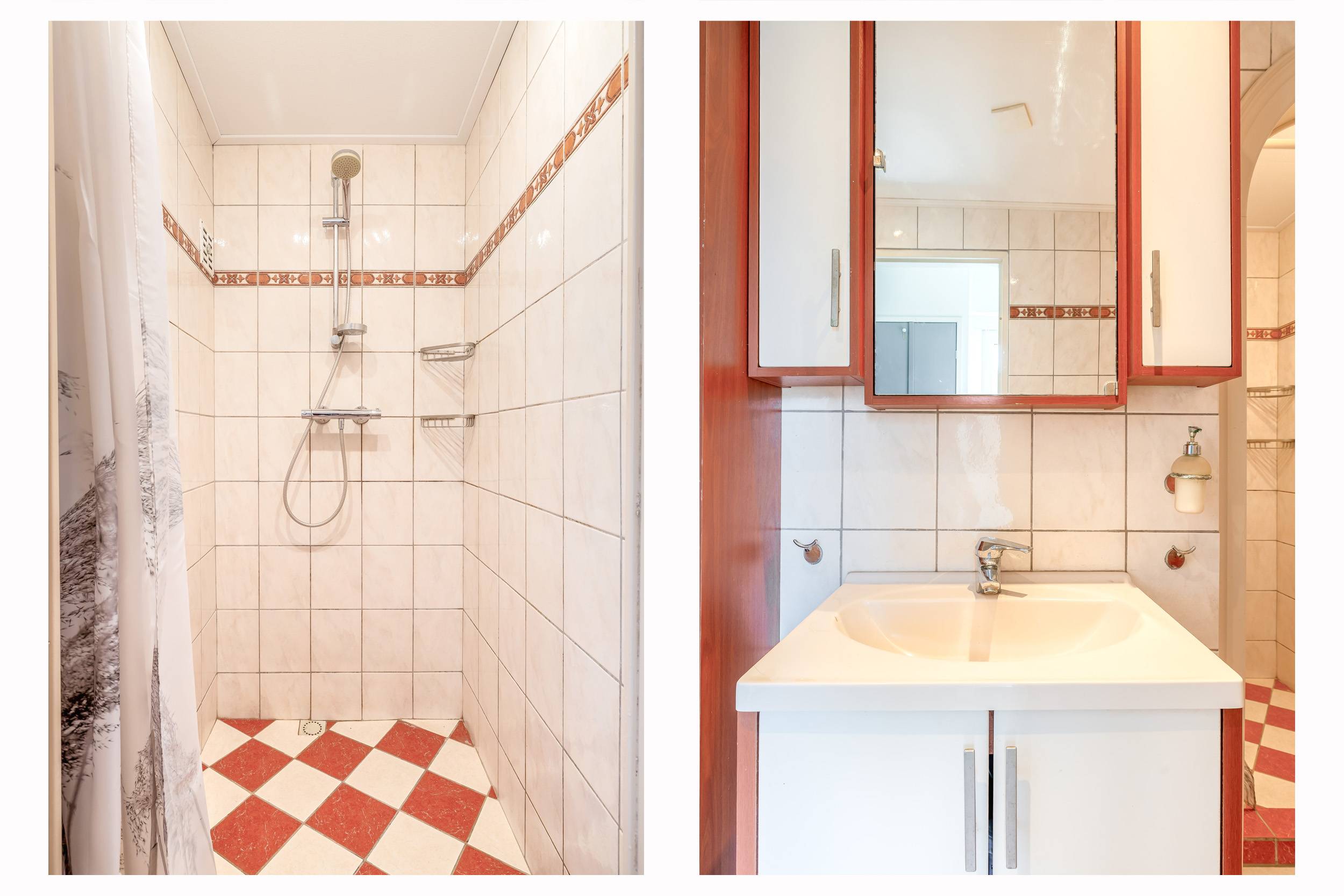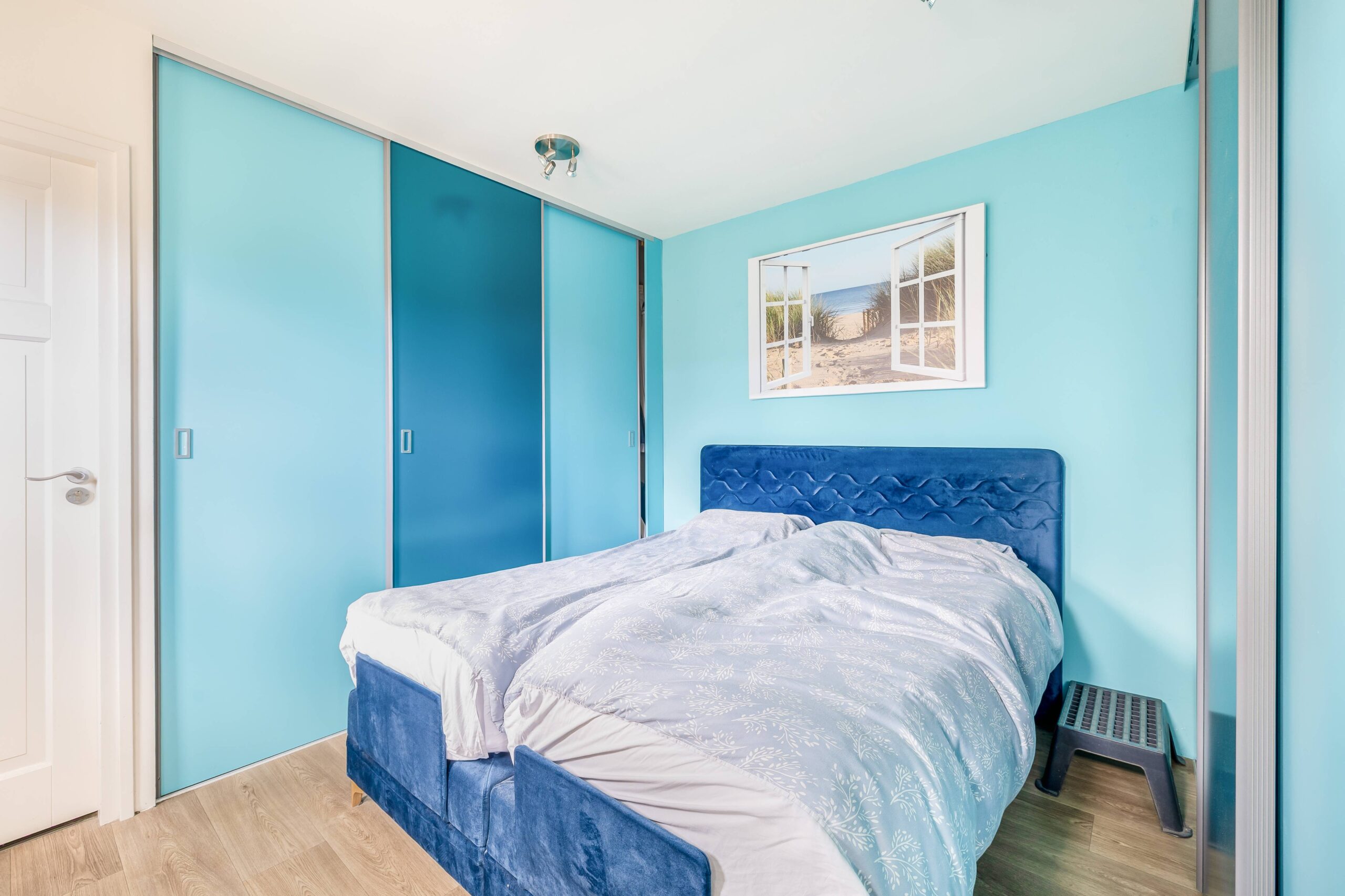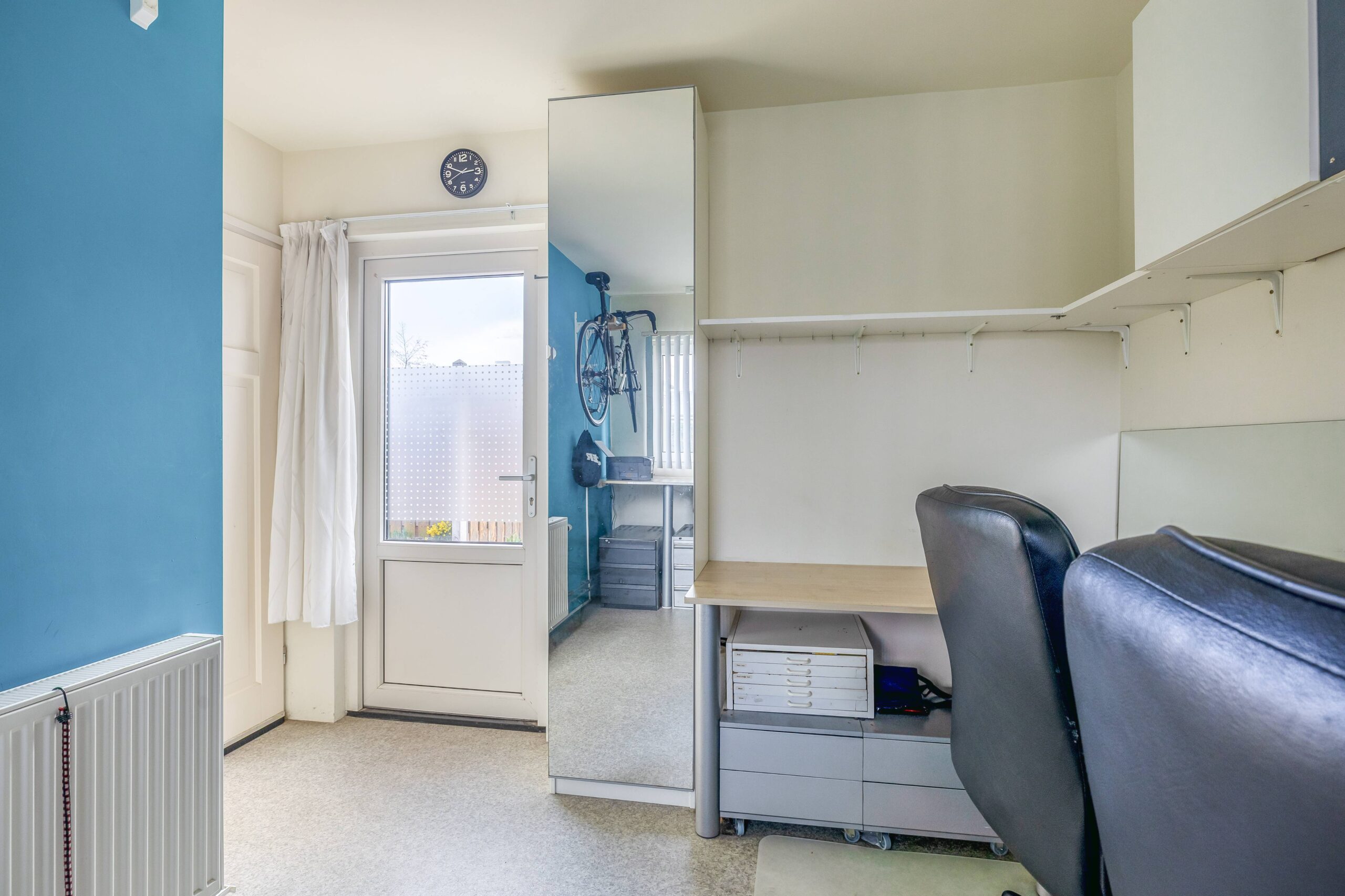 Op de begane grond vervolgens twee comfortabele slaapkamers waarbij de hoofdslaapkamer er vroeger 2 waren maar thans in gebruik door kasten aan weerskanten van het bed. Vanuit de achterste slaapkamer bereik je met een vlizotrap de schuine zolder waar je nog veel meer mogelijkheden hebt. Denk aan het realiseren van een vaste trap en met dakramen een extra verblijfsruimte.