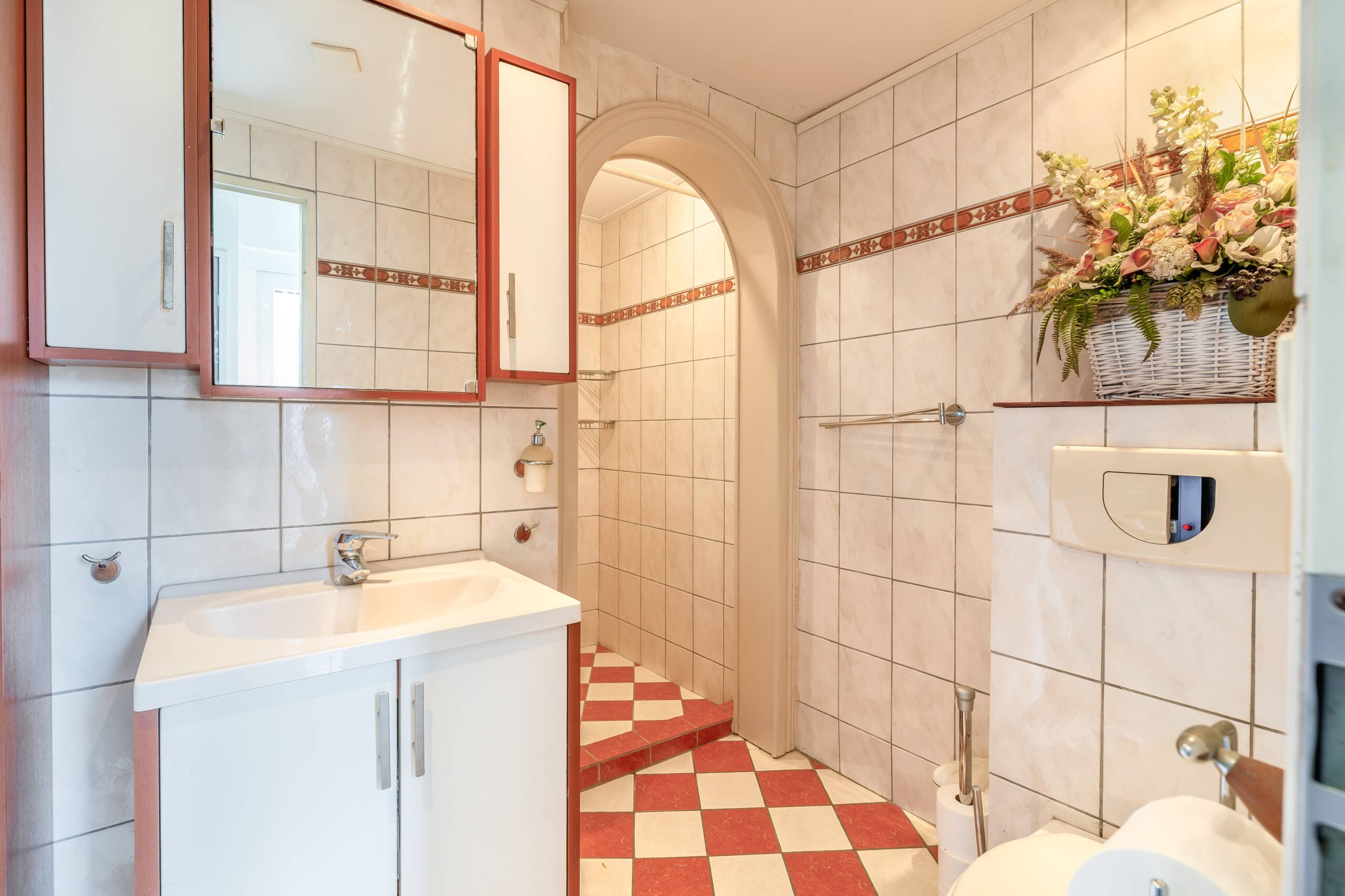 De badkamer is compleet met een inloopdouche, vrijdragend toilet en een wastafelmeubel.