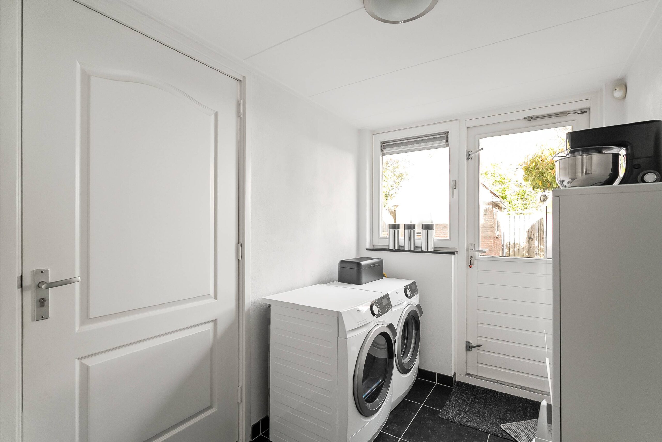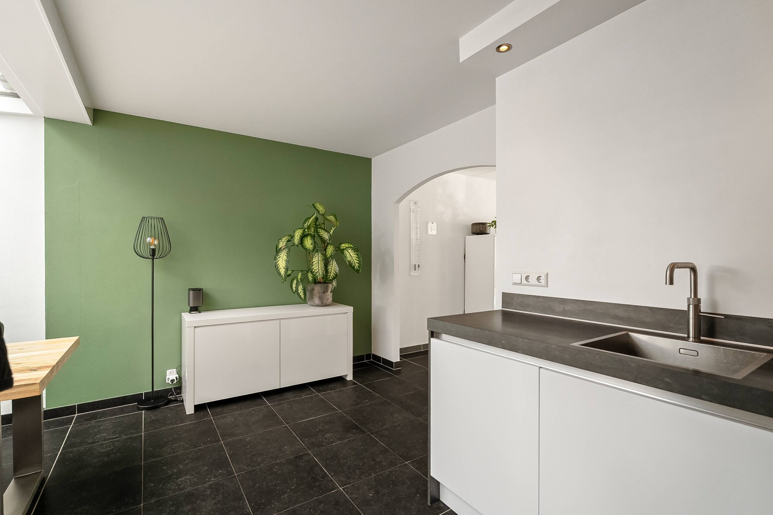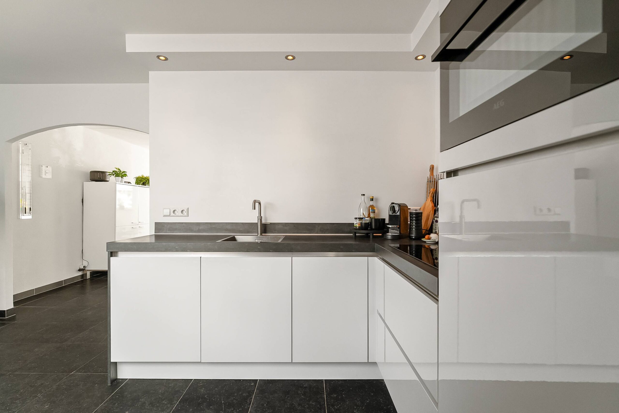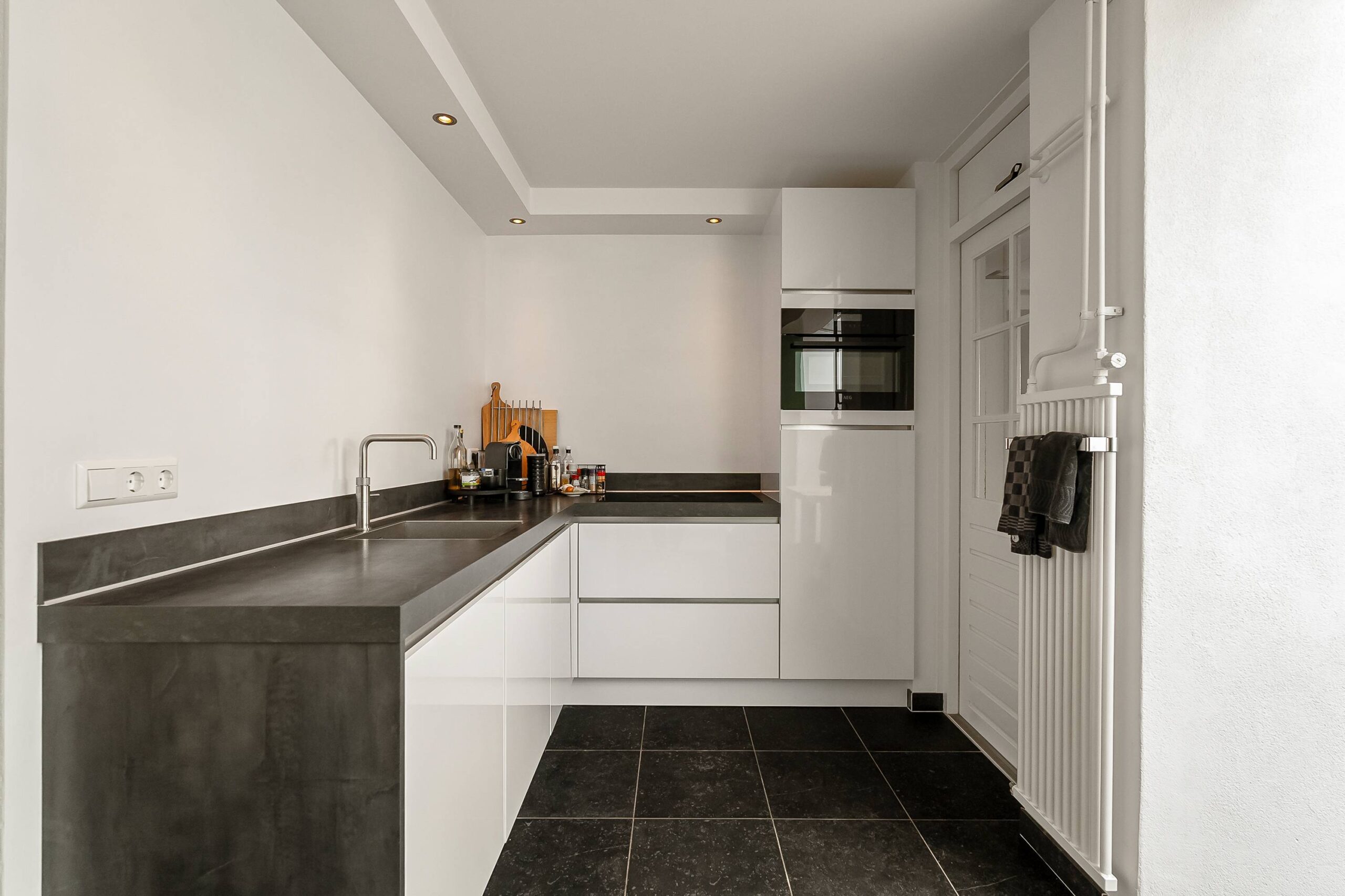De moderne inbouwkeuken is van alle gemakken voorzien en vormt het hart van de woning. Grenzend aan de keuken bevindt zich een praktische bijkeuken, ideaal voor extra bergruimte of het plaatsen van witgoed. De begane grond is voorzien van vloerverwarming, wat zorgt voor extra wooncomfort en een aangenaam klimaat in elk seizoen.