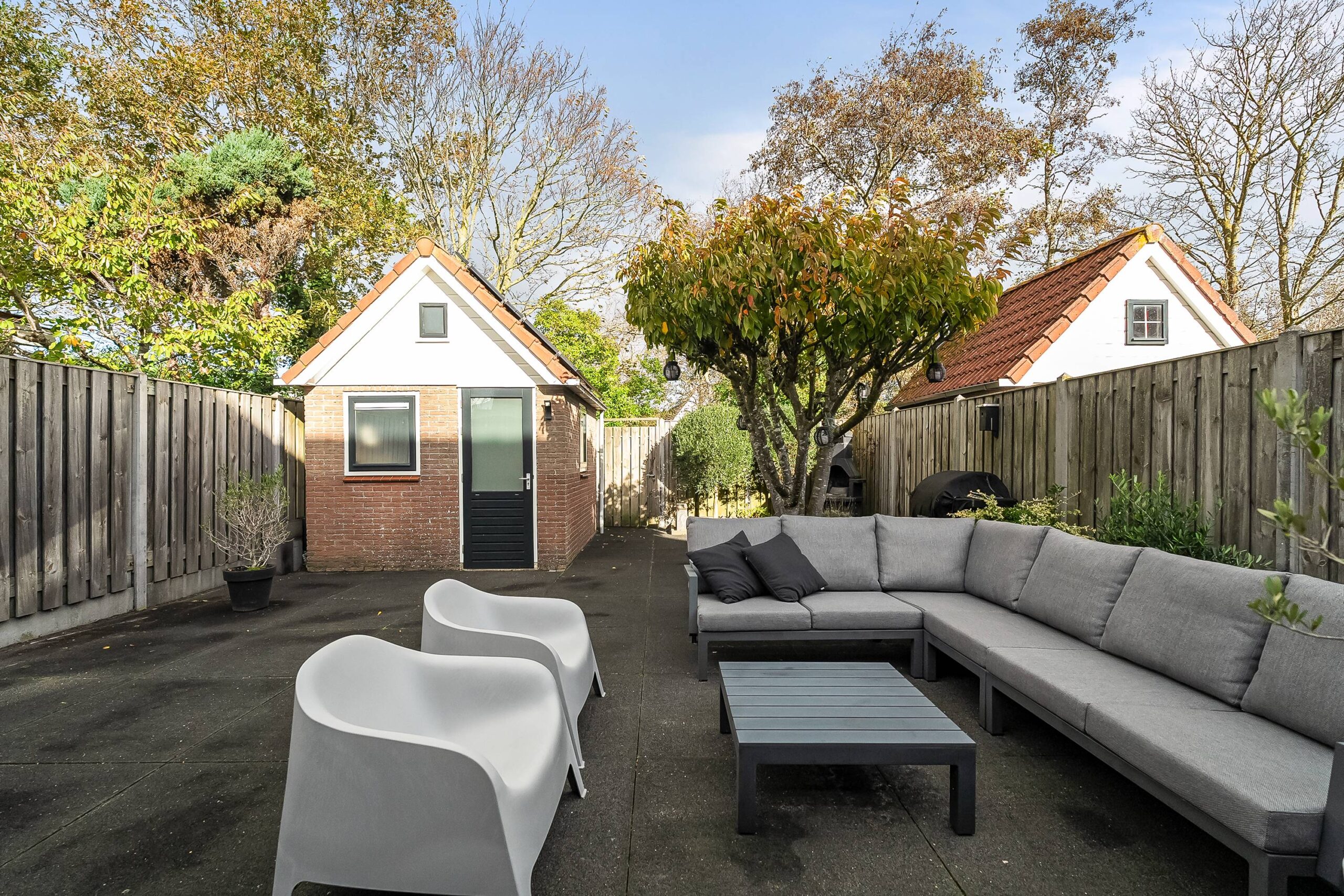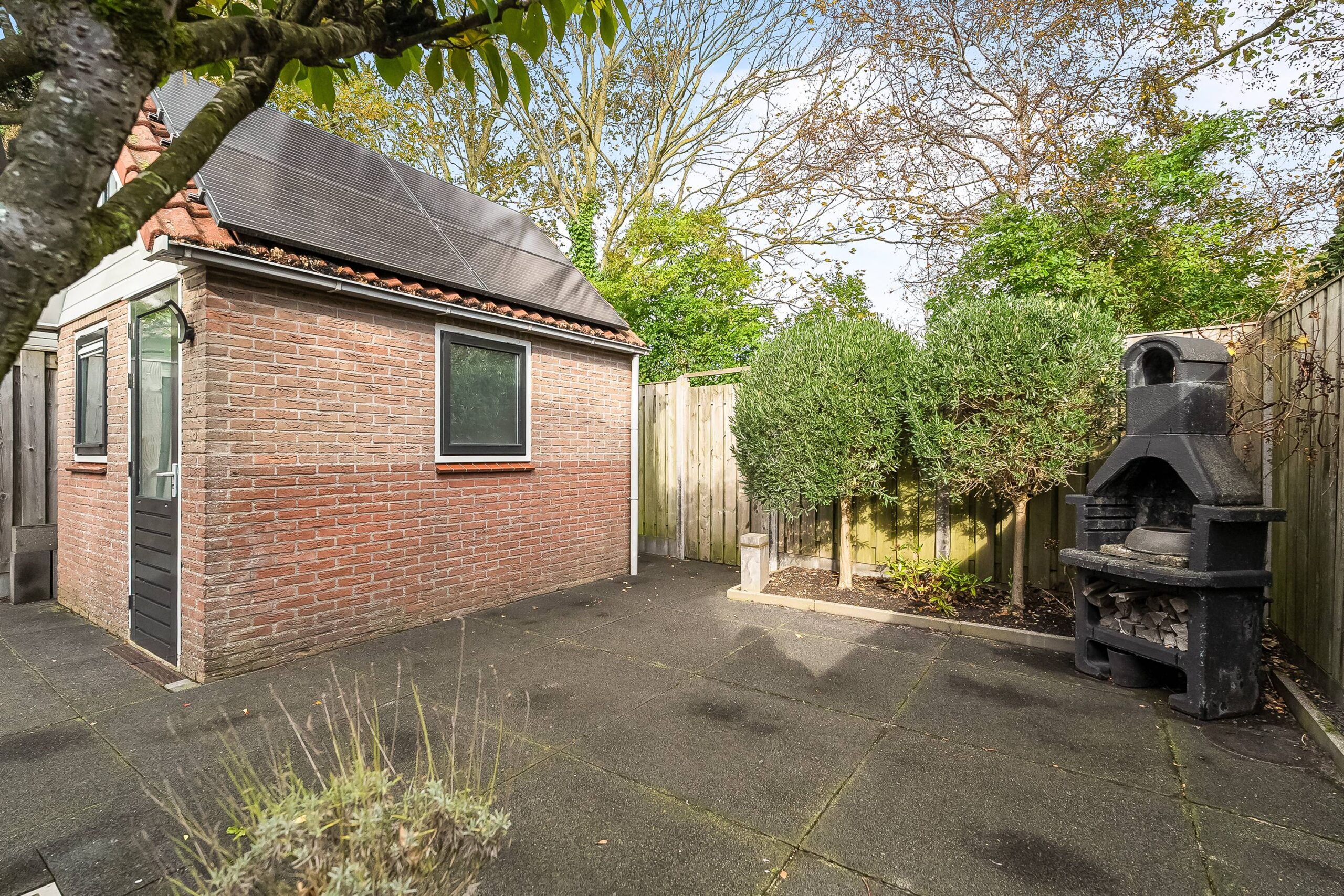 De ruime, op het noorden gelegen tuin biedt een vrij uitzicht en beschikt achterin over een vrijstaande stenen berging met 4 zonnepanelen.