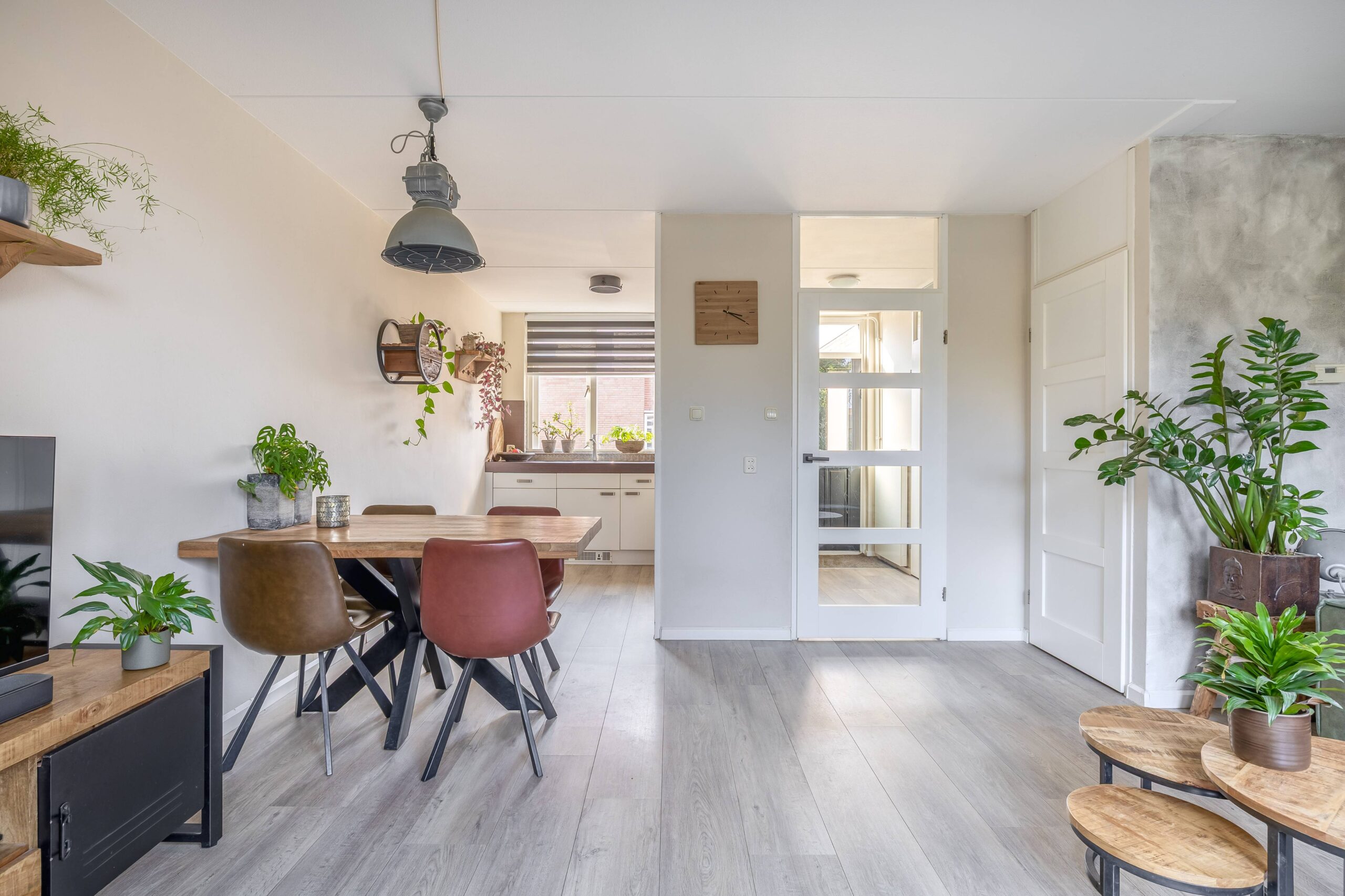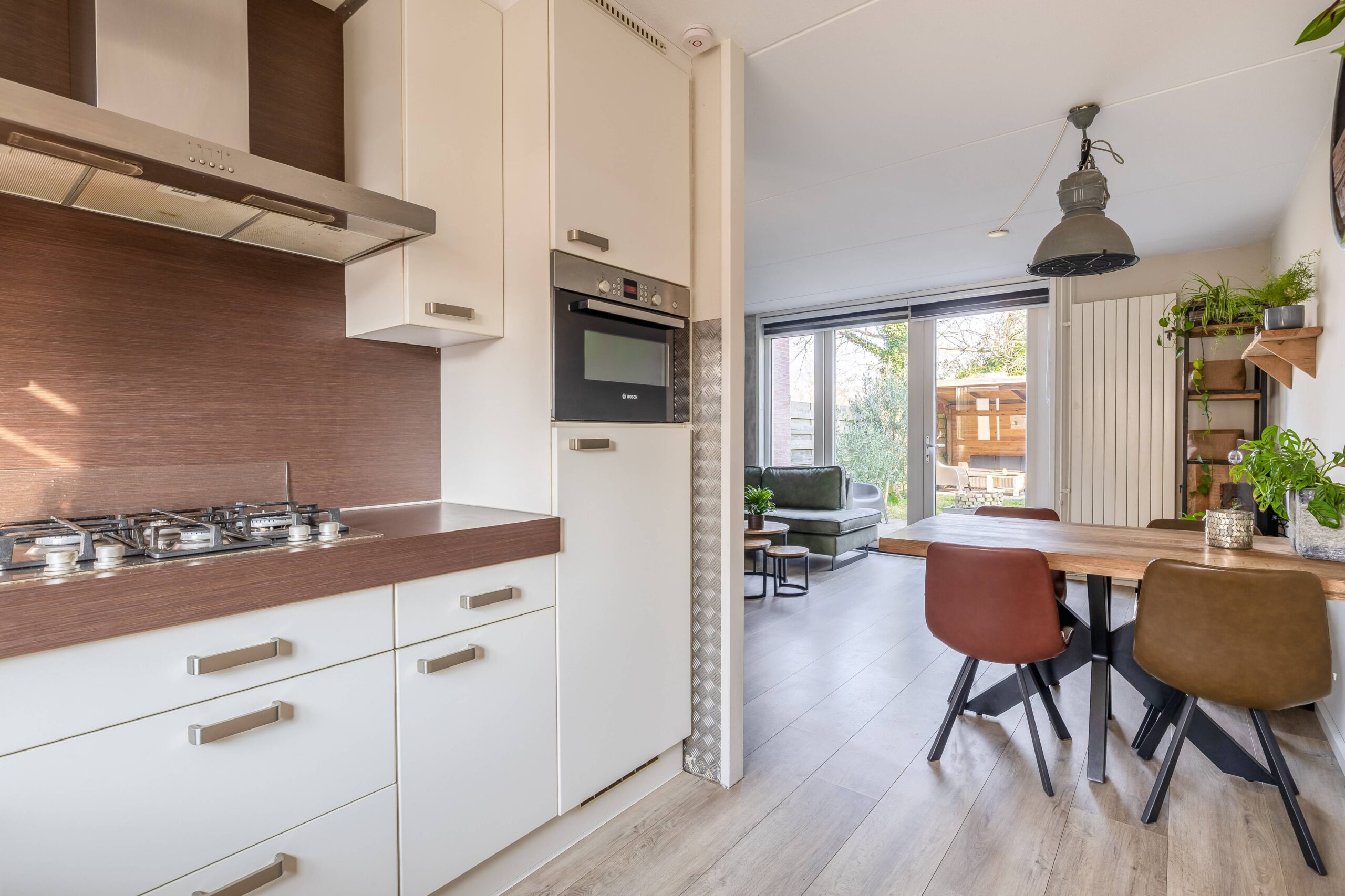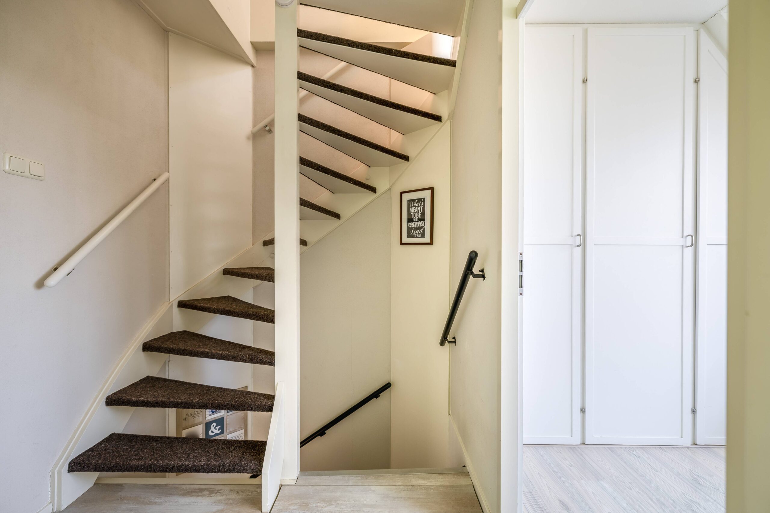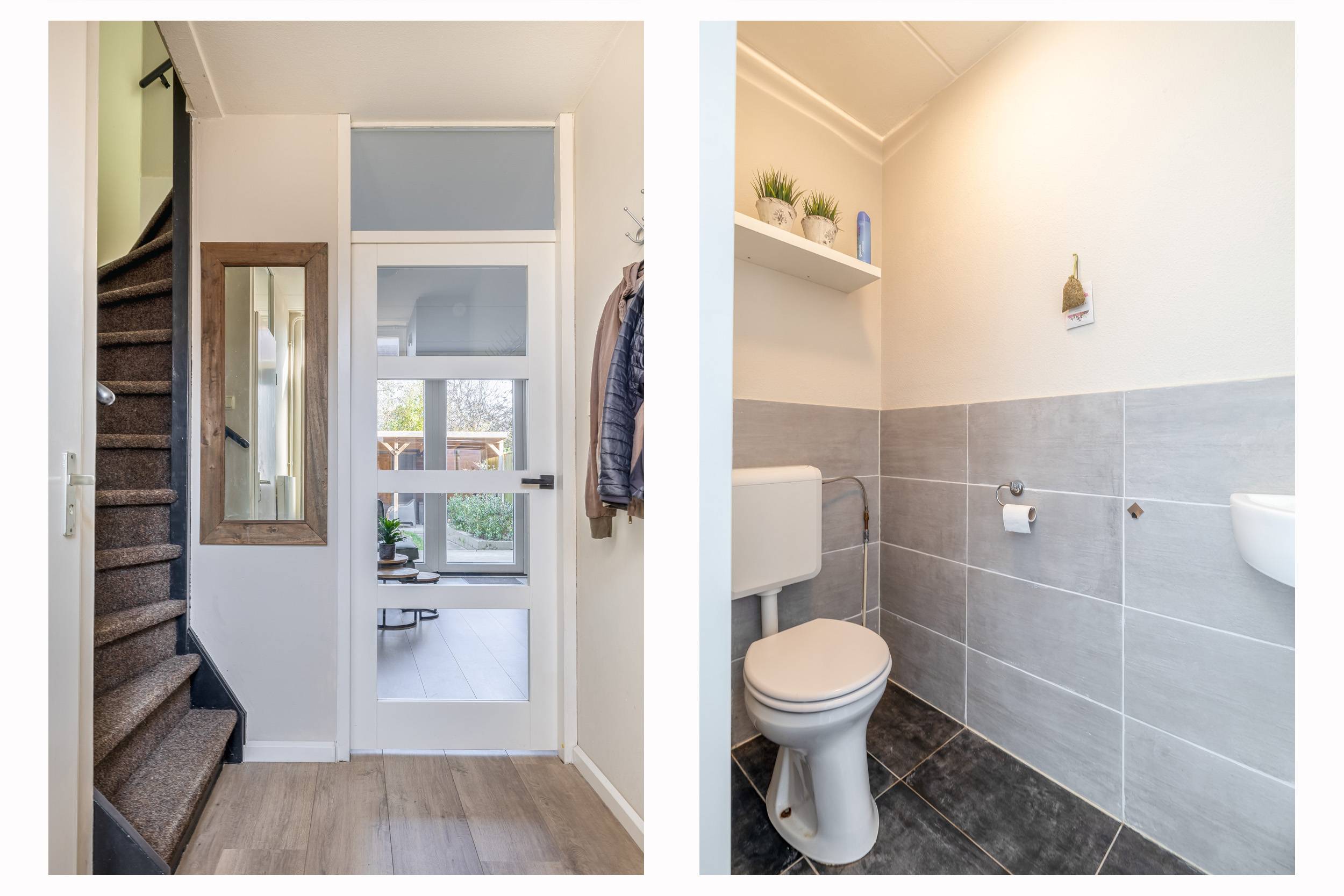 Entree woning, hal met meterkast, trapopgang en toiletruimte. De open keuken bevindt zich aan de voorzijde van de woning en is voorzien van een gaskookplaat, afzuigkap, koelkast, combimagnetron en vaatwasser. De woonkamer is tuingericht en dankzij de grote raampartij aan de achterzijde is dit een fijne, lichte ruimte. Onder de trap is een praktische bergkast aanwezig.