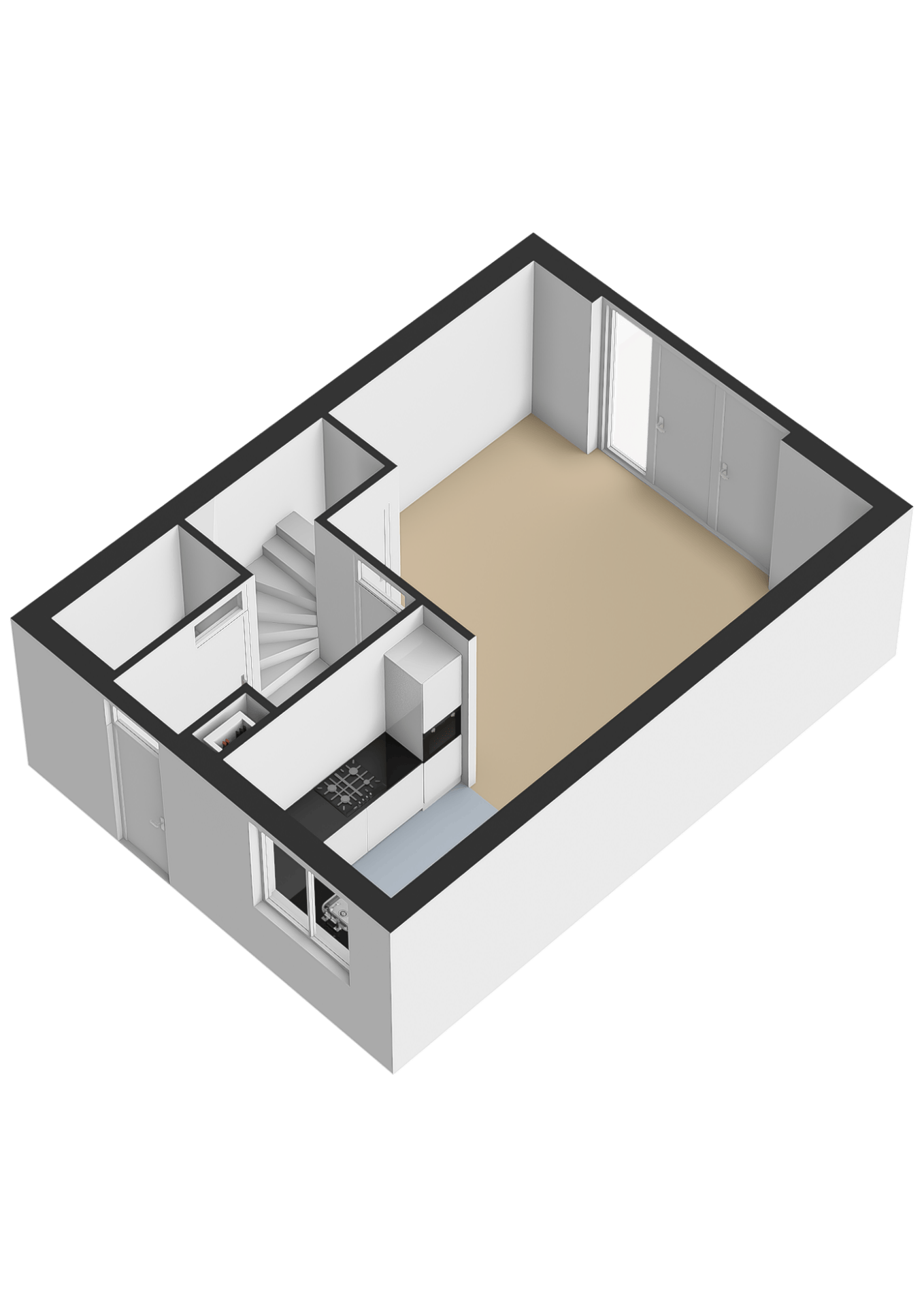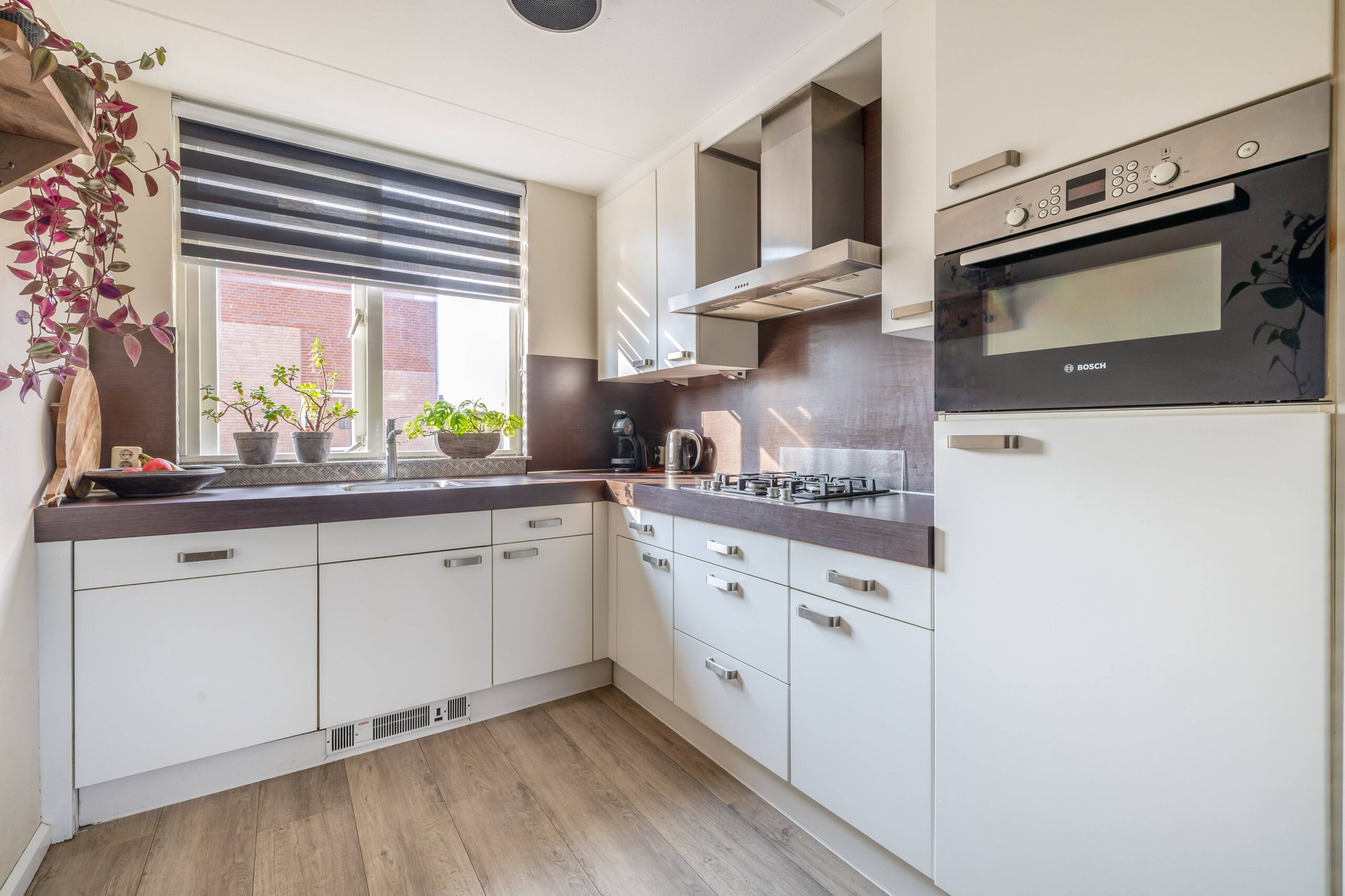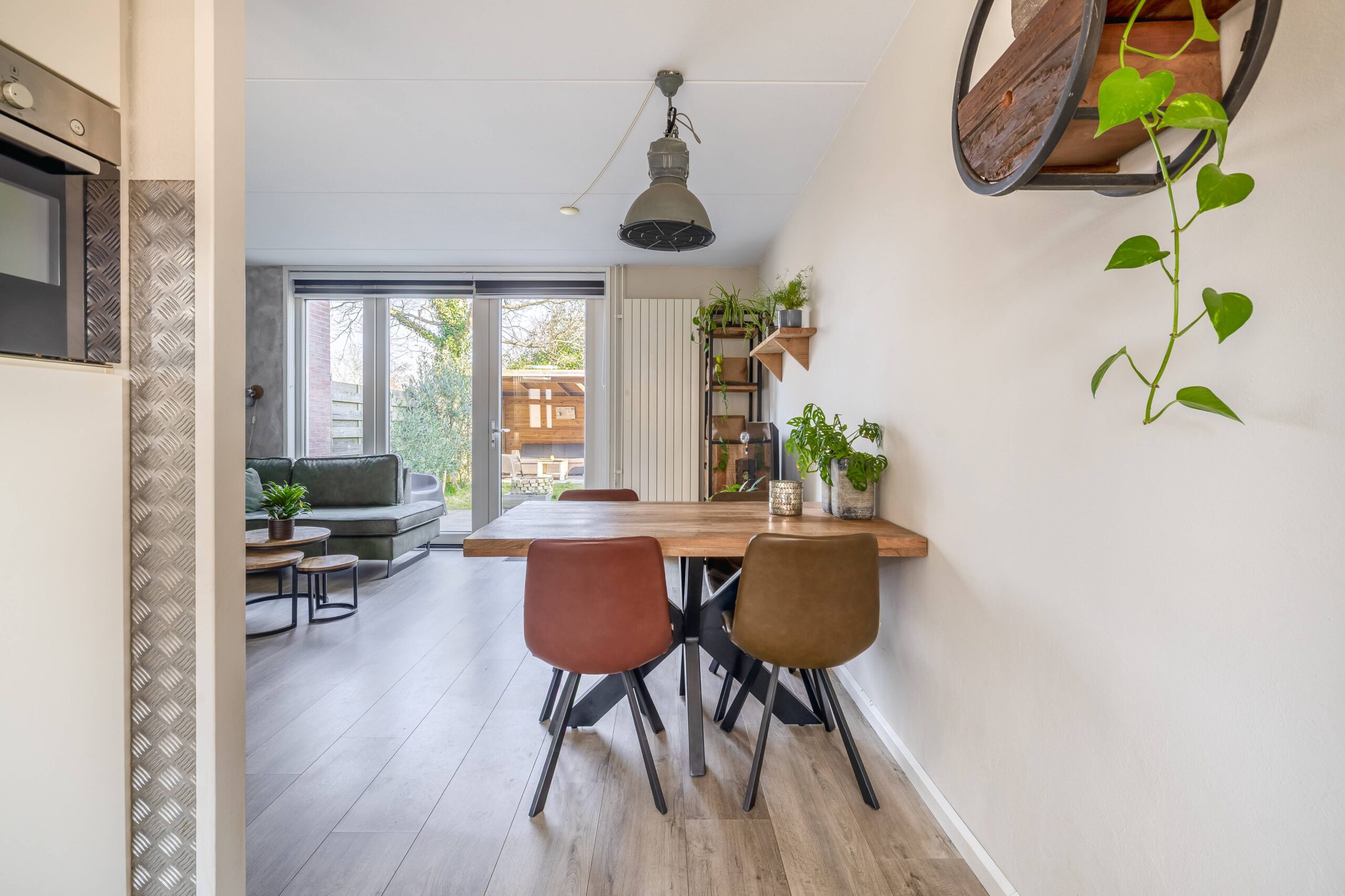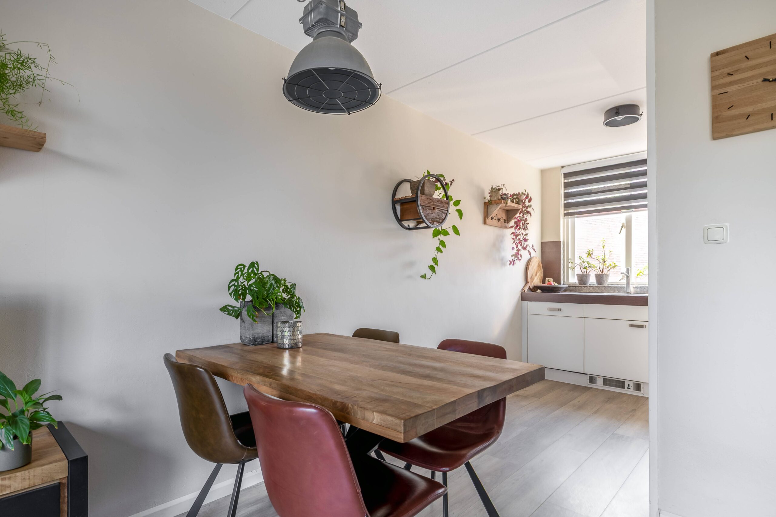 Entree woning, hal met meterkast, trapopgang en toiletruimte. De open keuken bevindt zich aan de voorzijde van de woning en is voorzien van een gaskookplaat, afzuigkap, koelkast, combimagnetron en vaatwasser. De woonkamer is tuingericht en dankzij de grote raampartij aan de achterzijde is dit een fijne, lichte ruimte. Onder de trap is een praktische bergkast aanwezig.