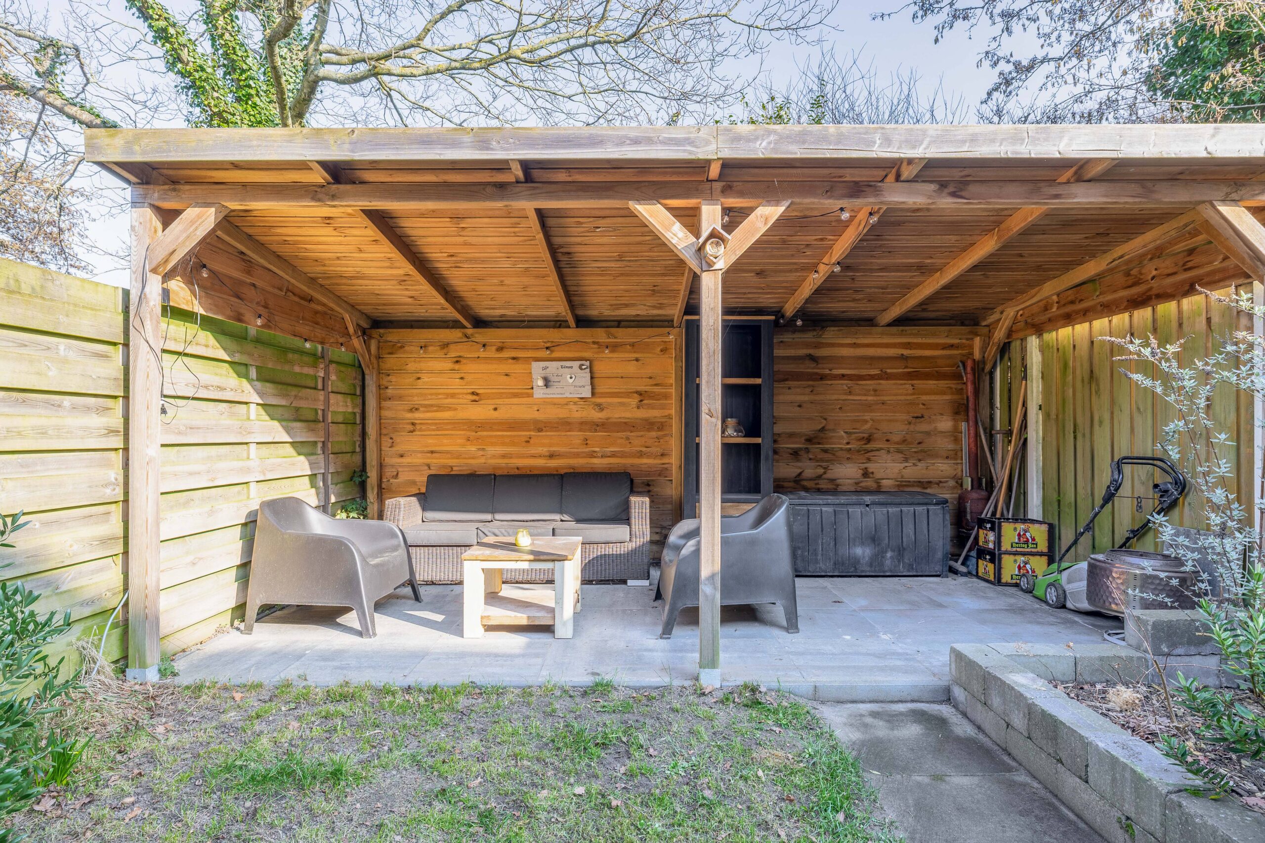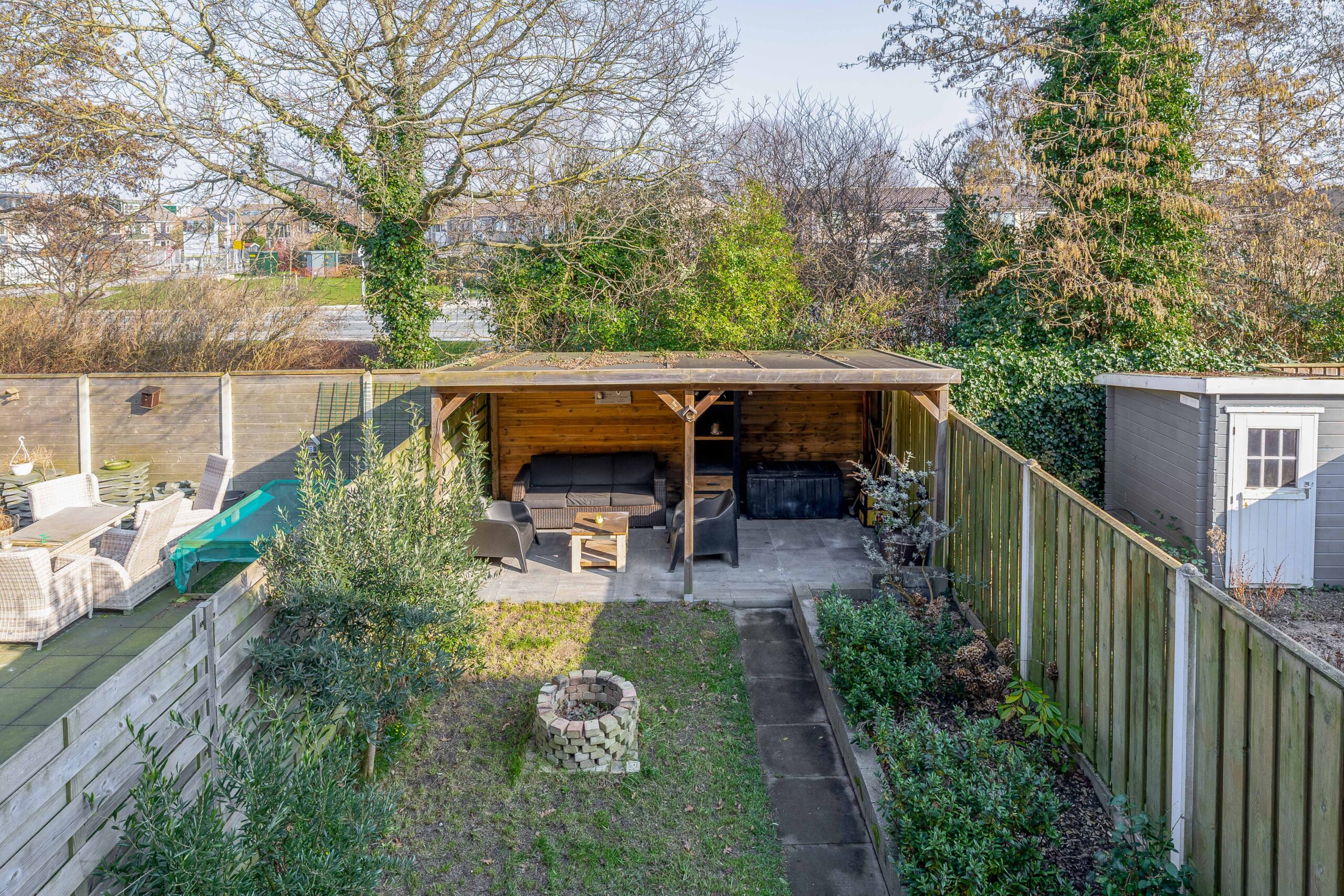 Via de kunststof tuindeuren loop je de fijne achtertuin in. Deze is op het zonnige zuidoosten gelegen en biedt veel privacy doordat er geen directe bebouwing achter de woning staat. Achterin de tuin staat een fijne overkapping.