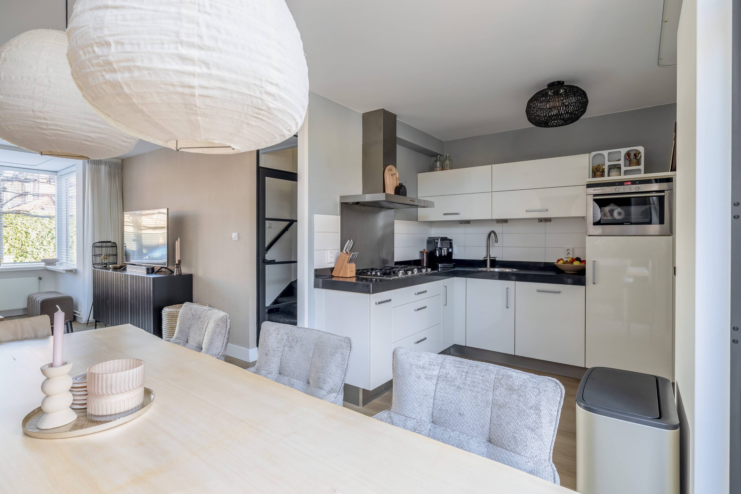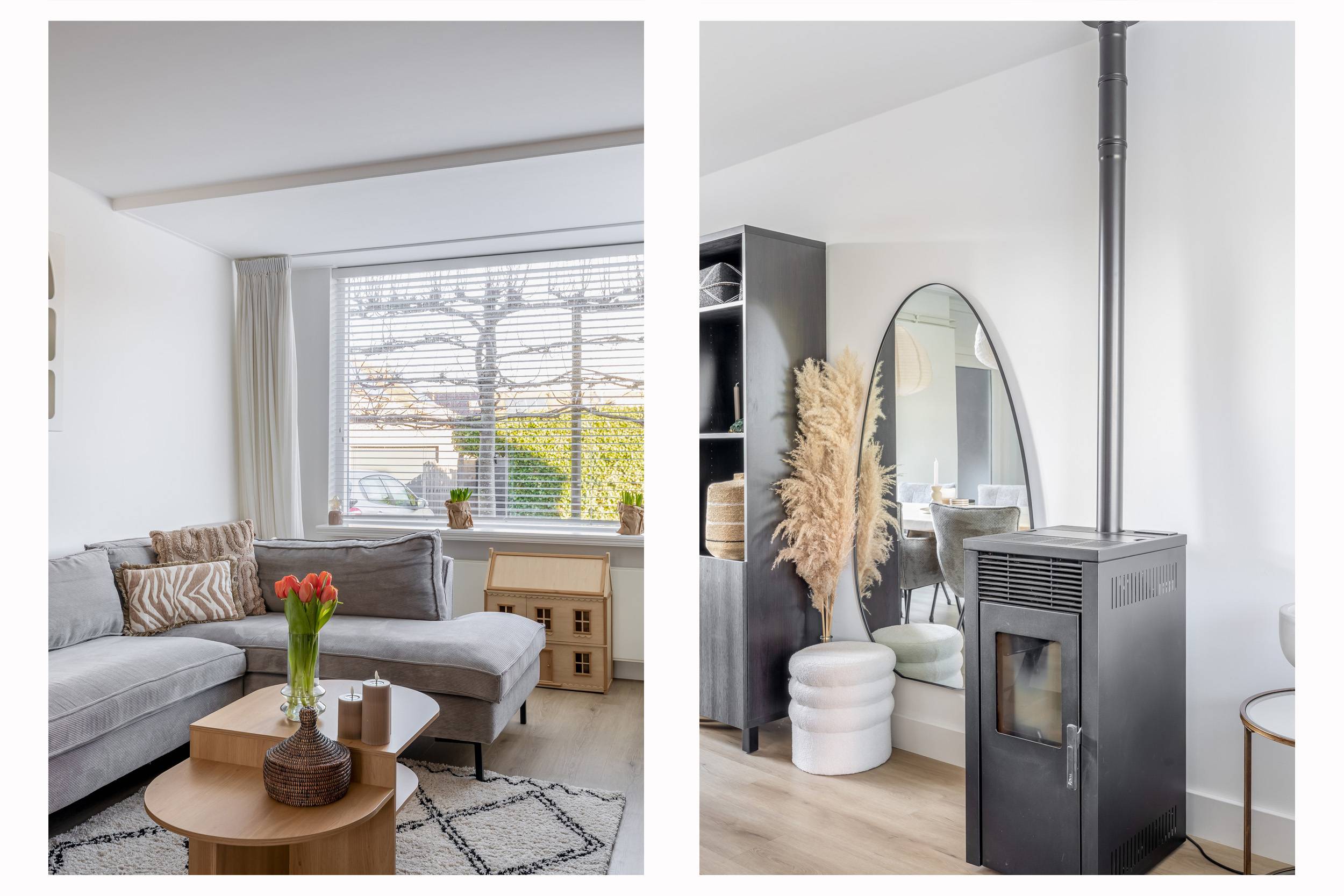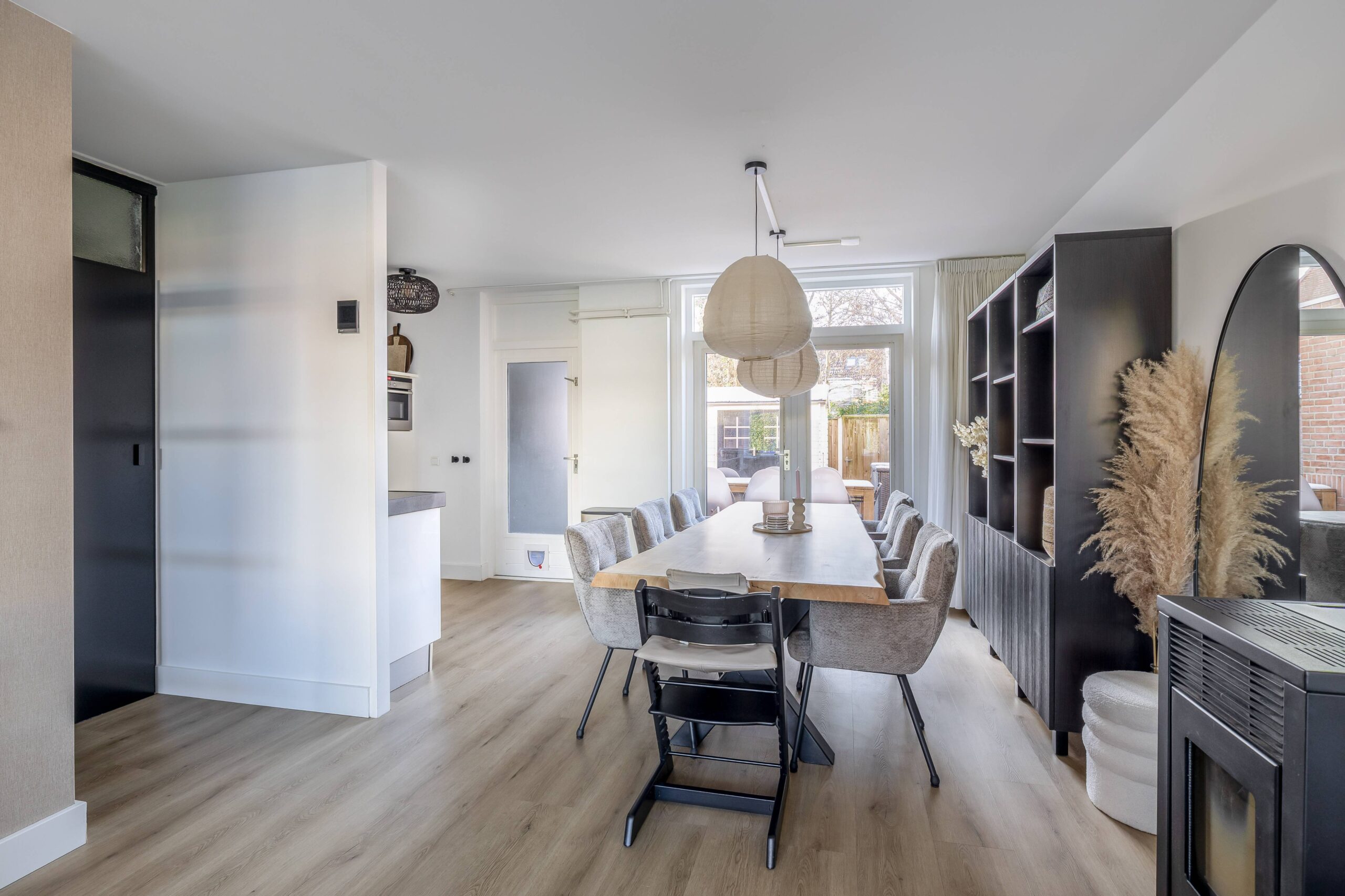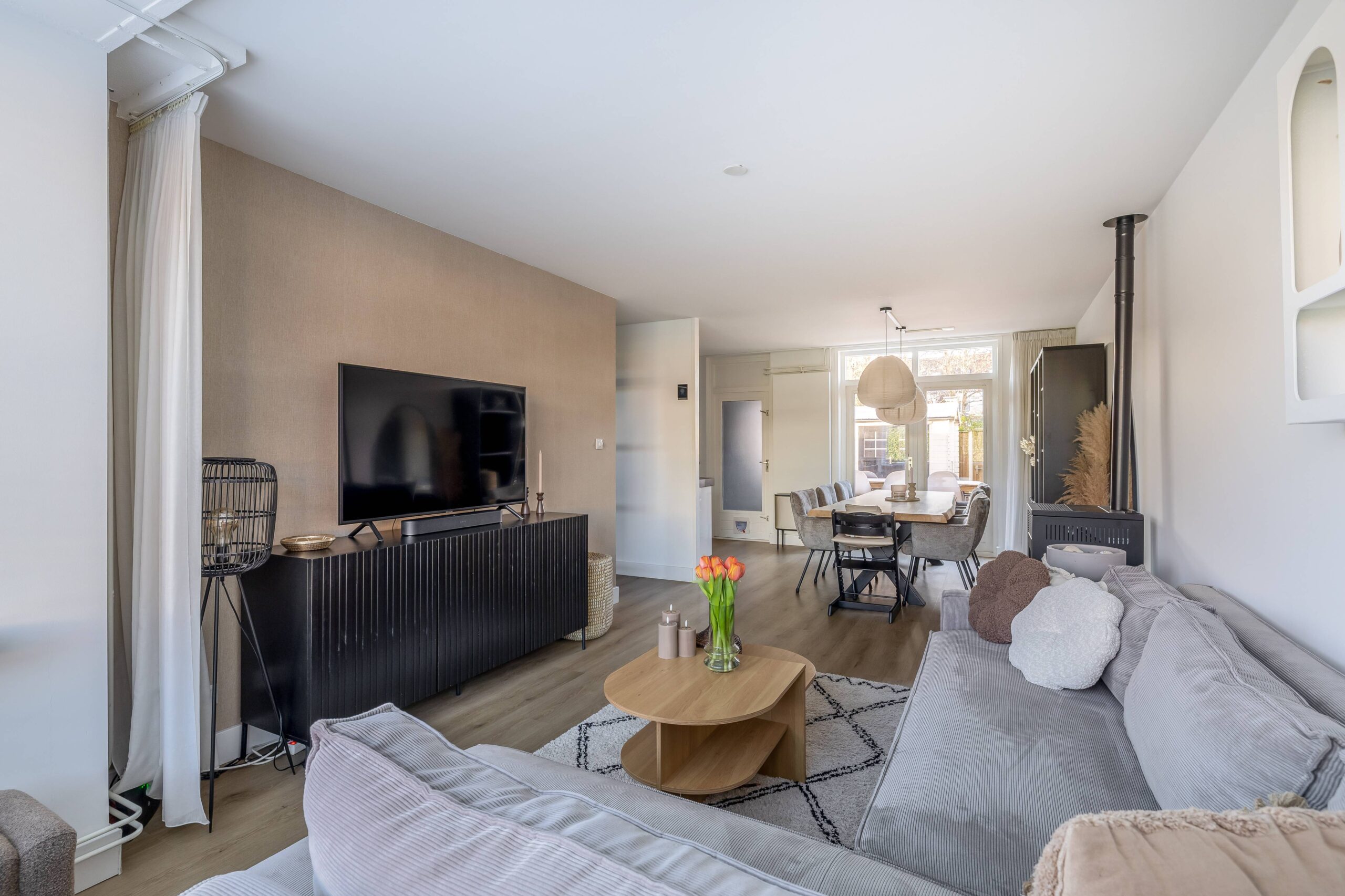 Entree/hal met meterkast, trapopgang en modern toilet met fontein. In de woonkamer en keuken zijn de wanden en plafonds strak gestuct, wat zorgt voor een moderne en frisse uitstraling. De woonkamer heeft een sfeervolle erker en openslaande deuren aan de tuinzijde. De keuken is uitgevoerd in een neutrale kleurstelling en biedt toegang tot de praktische bijkeuken met extra keukenblok. Alle wenselijke apparatuur is aanwezig: een 5-pits gaskookplaat, afzuigkap, koelkast, combimagnetron, vaatwasser en kokend waterkraan.