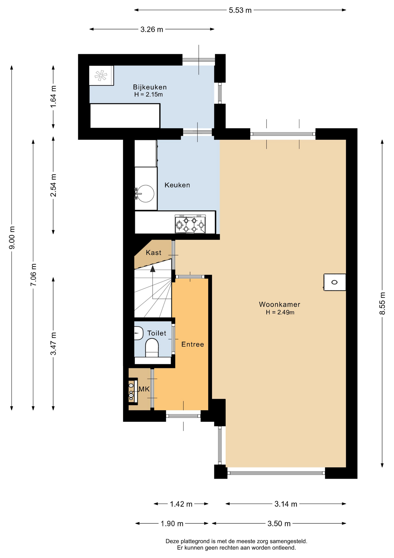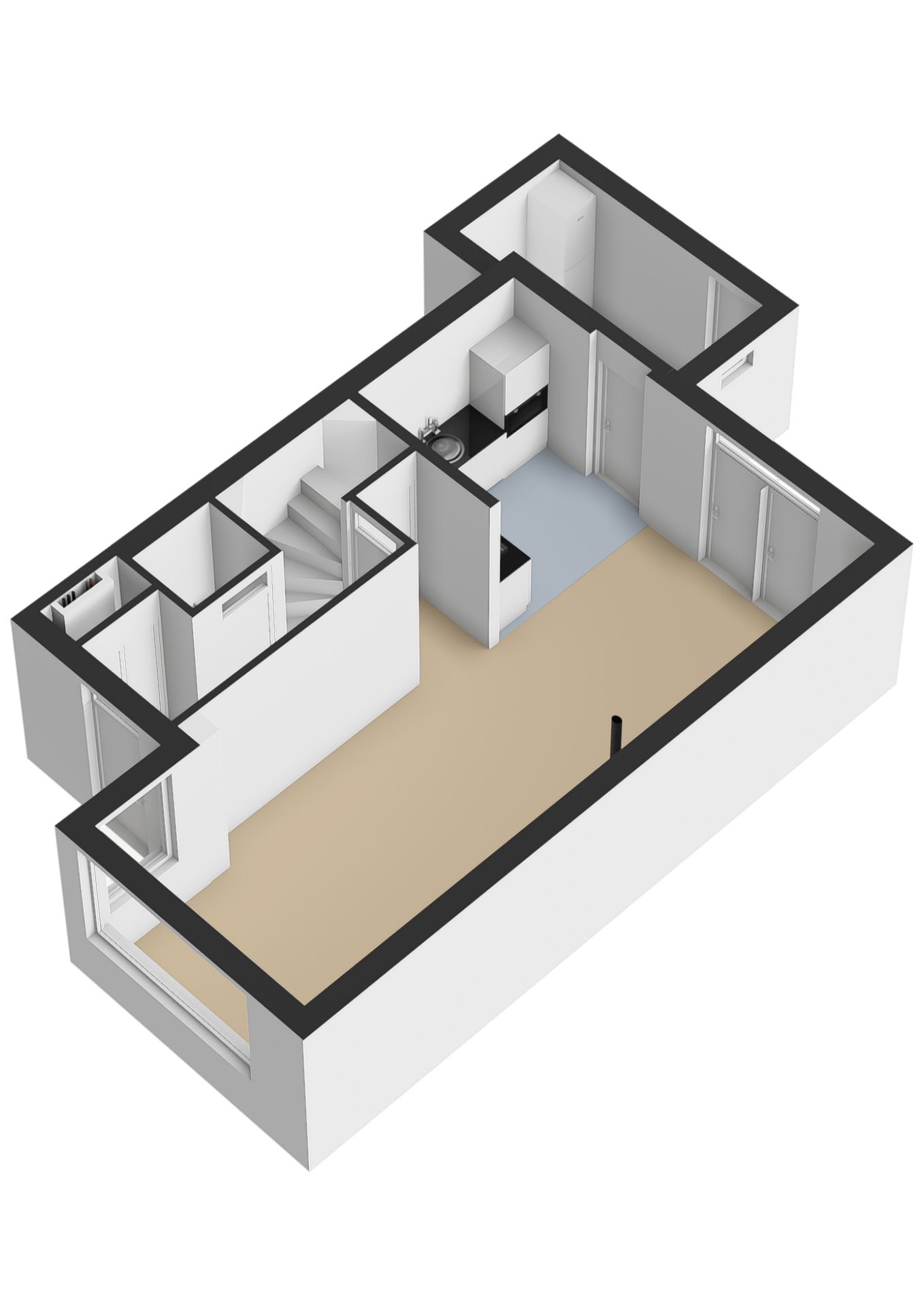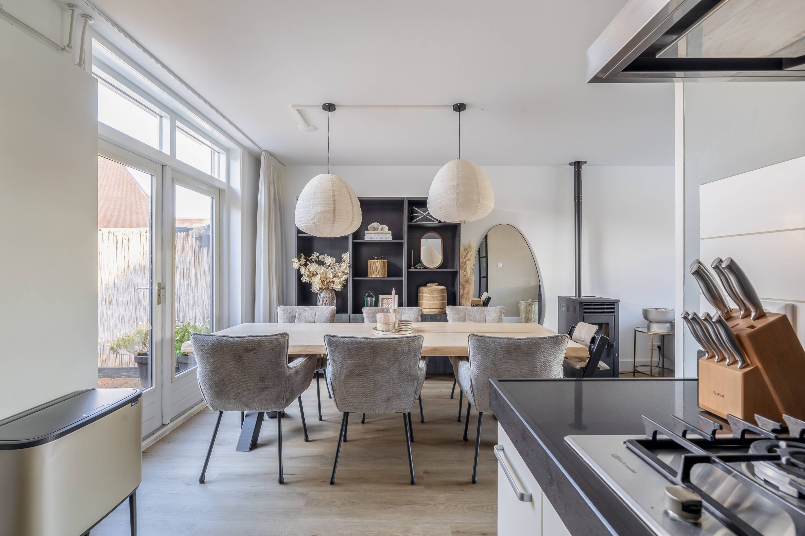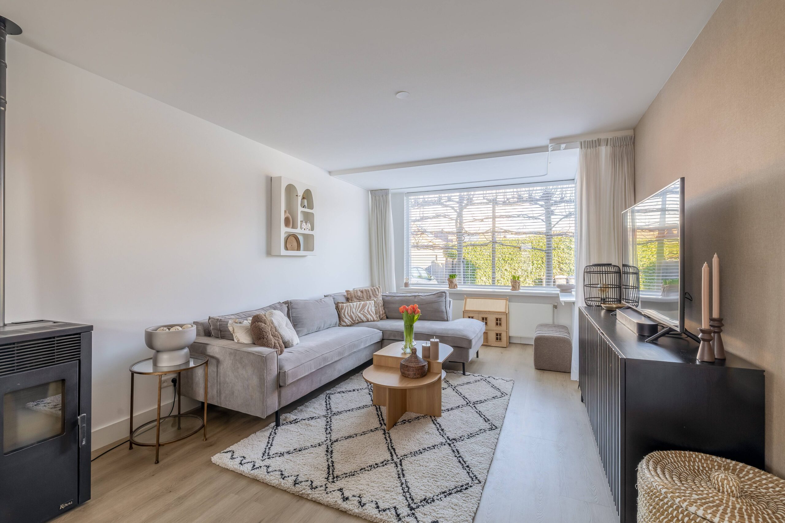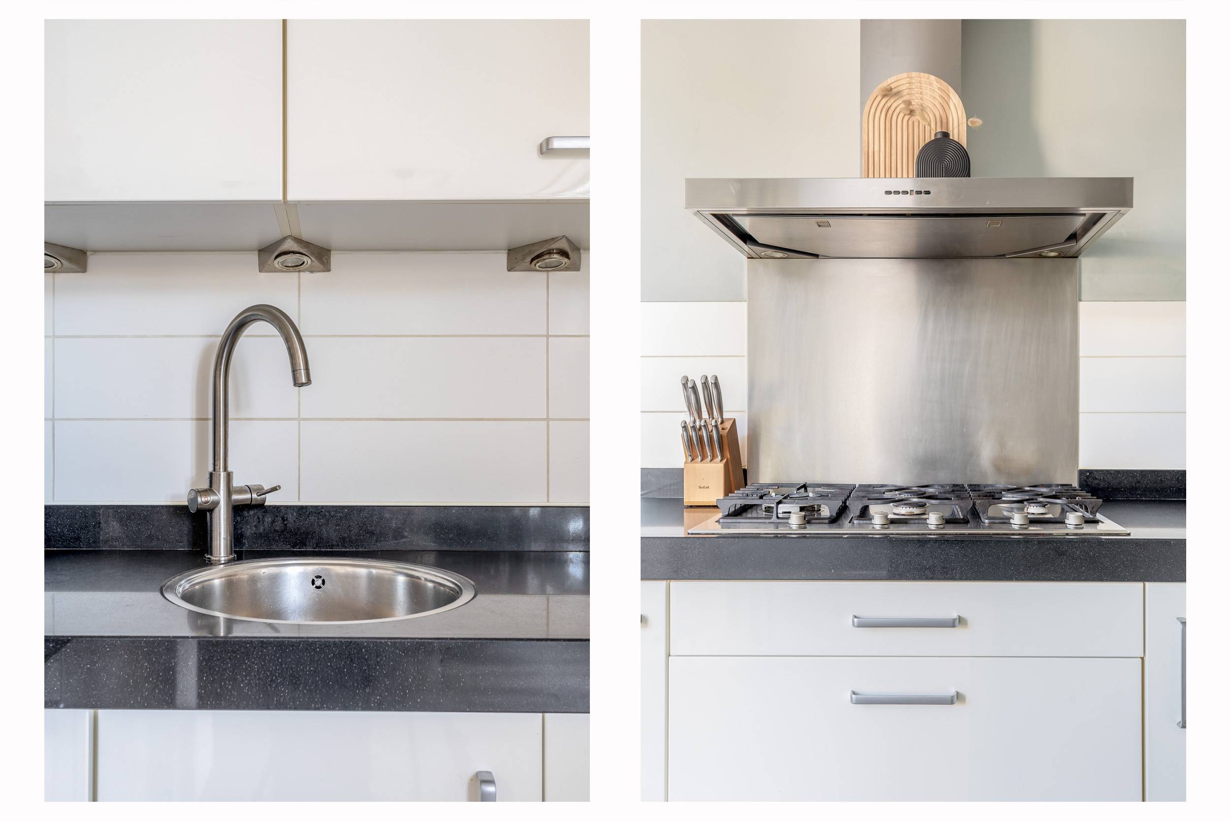Entree/hal met meterkast, trapopgang en modern toilet met fontein. In de woonkamer en keuken zijn de wanden en plafonds strak gestuct, wat zorgt voor een moderne en frisse uitstraling. De woonkamer heeft een sfeervolle erker en openslaande deuren aan de tuinzijde. De keuken is uitgevoerd in een neutrale kleurstelling en biedt toegang tot de praktische bijkeuken met extra keukenblok. Alle wenselijke apparatuur is aanwezig: een 5-pits gaskookplaat, afzuigkap, koelkast, combimagnetron, vaatwasser en kokend waterkraan.